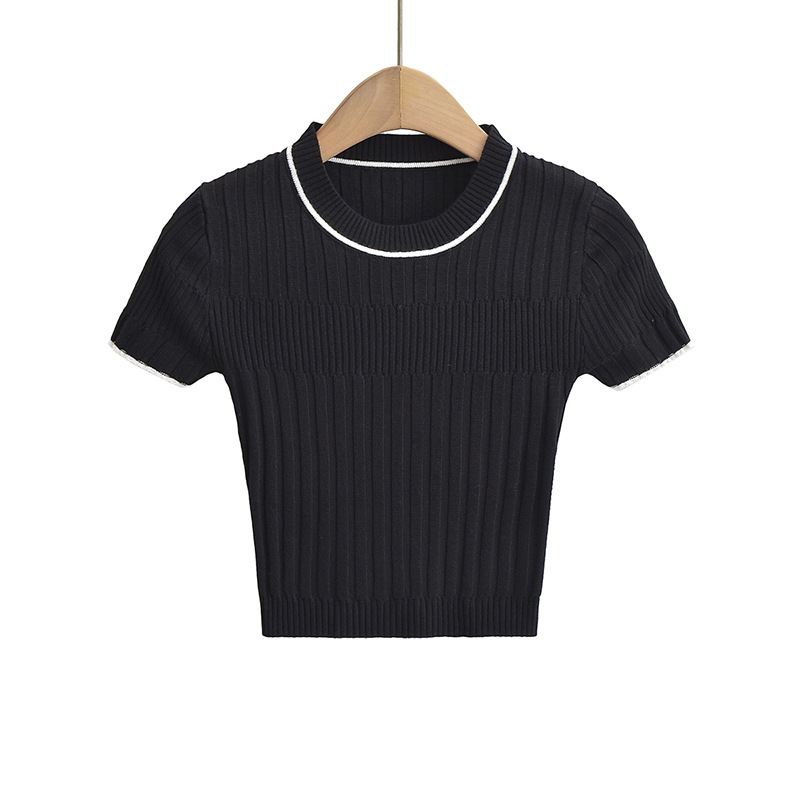Pure Desire 한국 컬러 매칭 스몰 라운드넥 니트 반팔 티셔츠 여성용 2023 여름 뉴 젠틀 슬림핏 숏탑스토어 가기