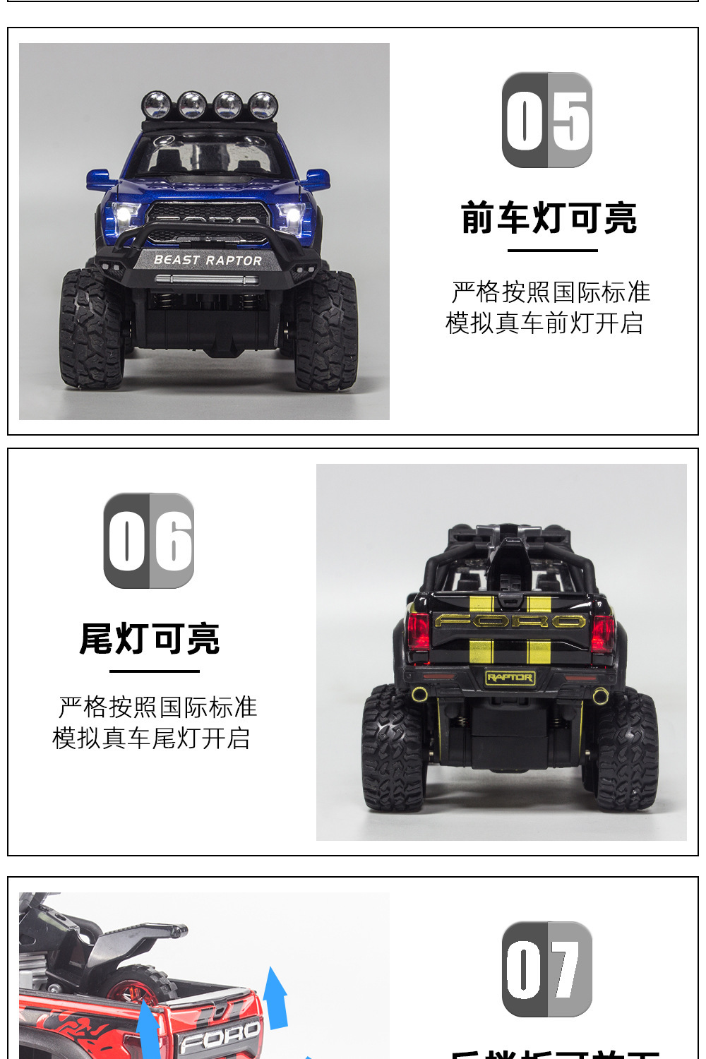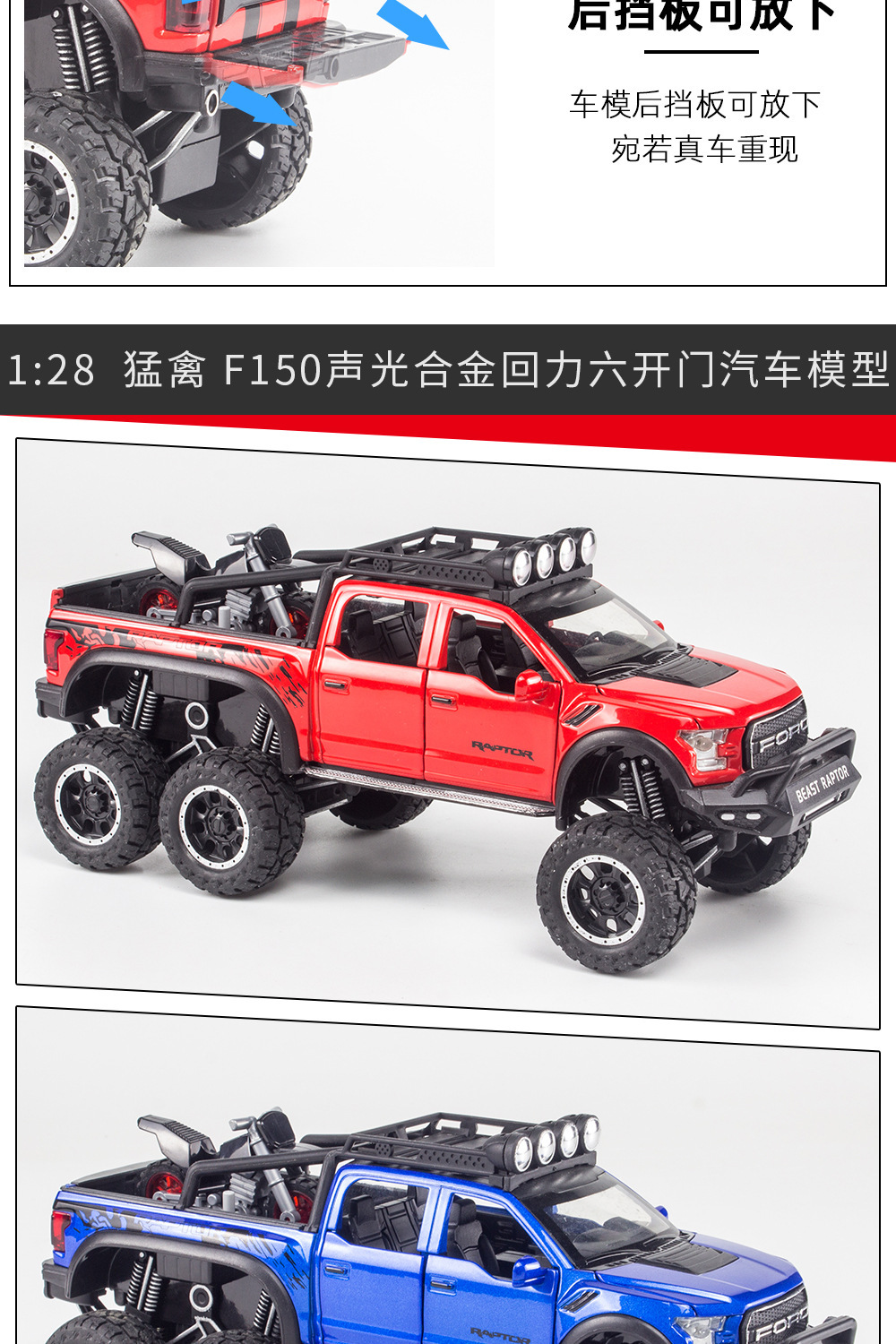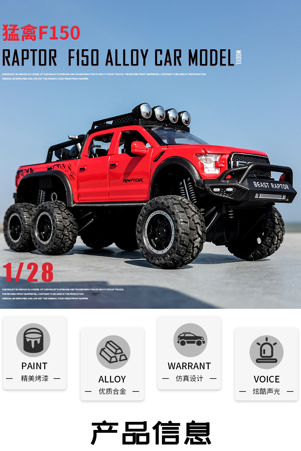 합금에 자동차 1:28 랩터 오프로드 픽업 F150 자동차 모델 소리와 가벼운 장난감 자동차 음악 모델 장식품 백 포스