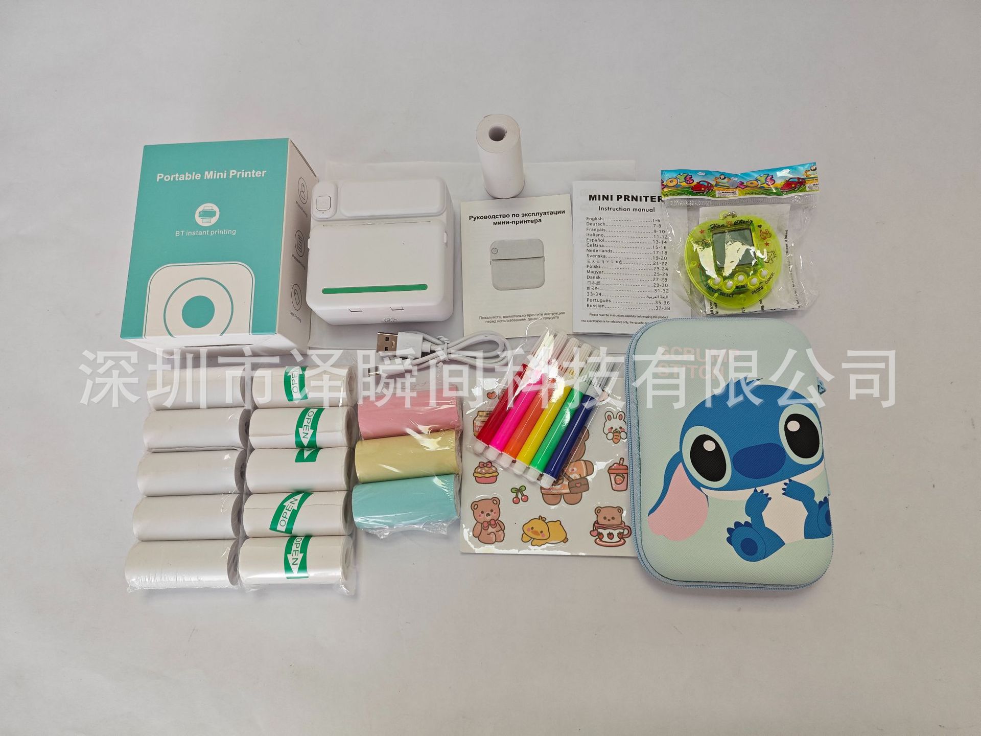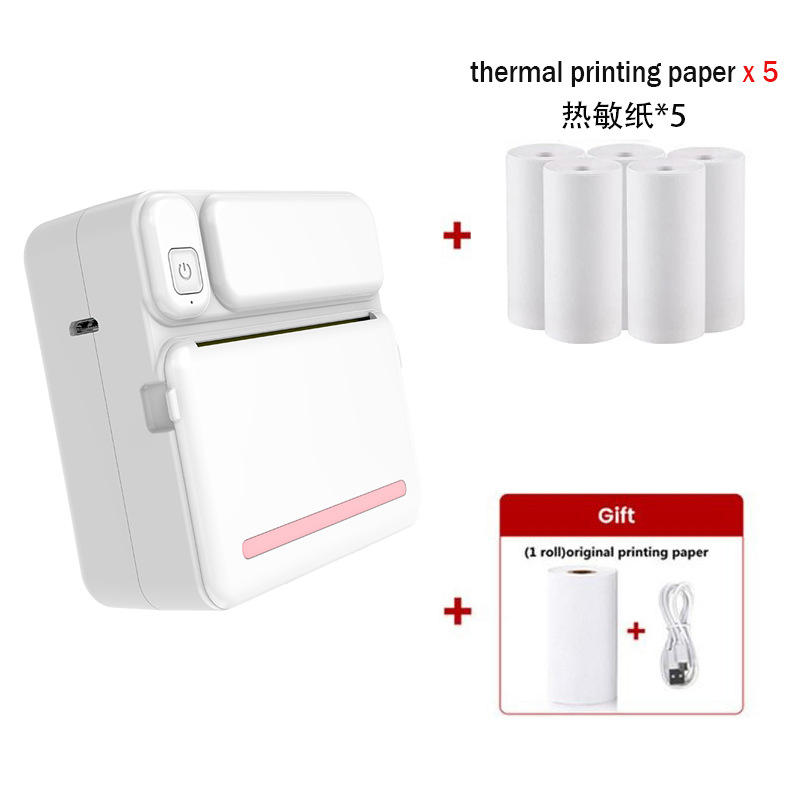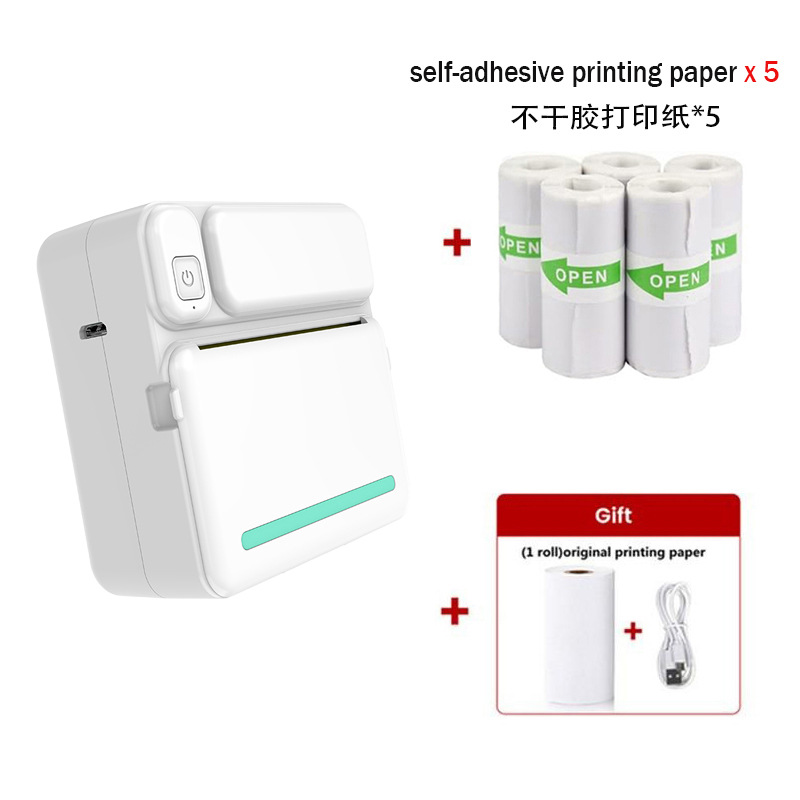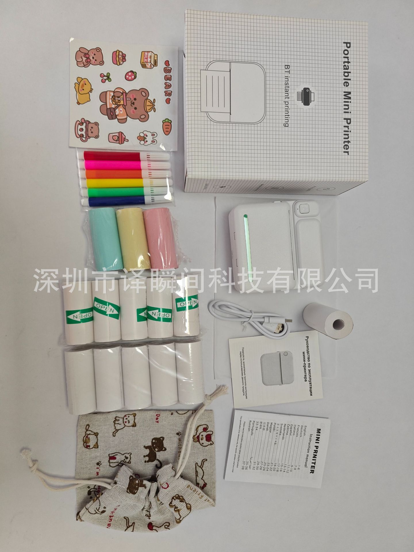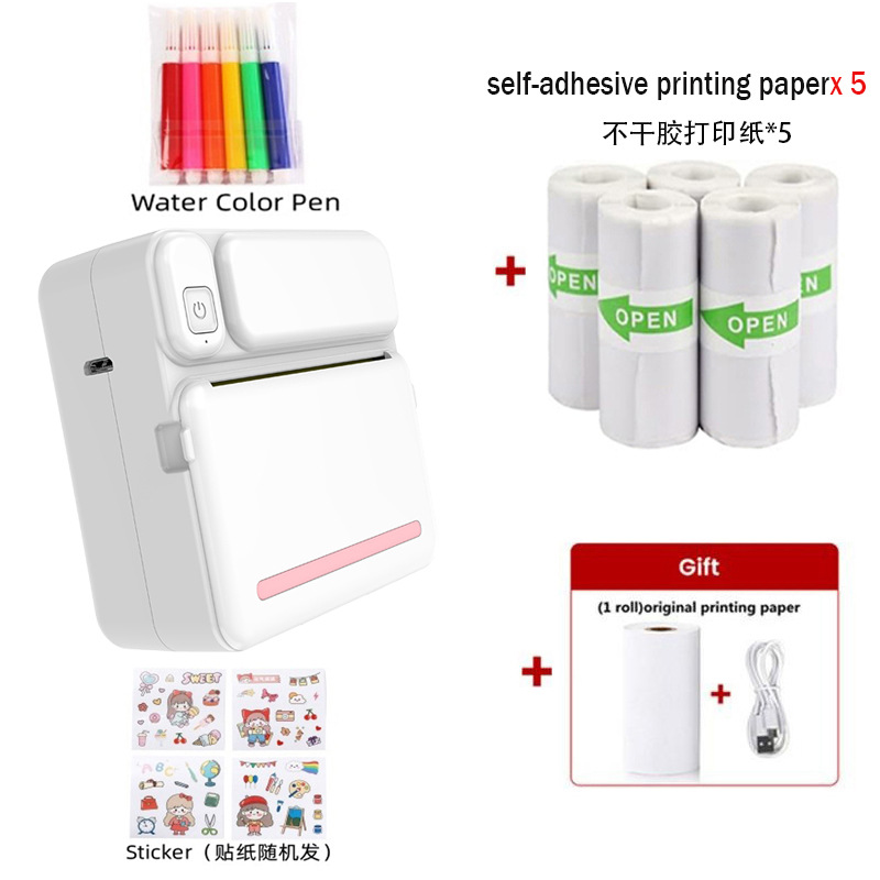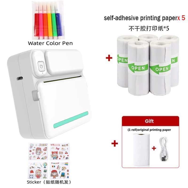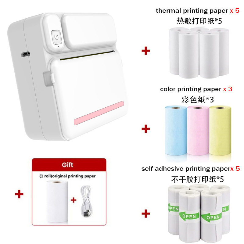 打印机1台+【自带1卷热敏纸+5卷热敏纸+5卷不干胶+3卷彩色纸+6支水彩笔+贴纸+布袋】为一整套。