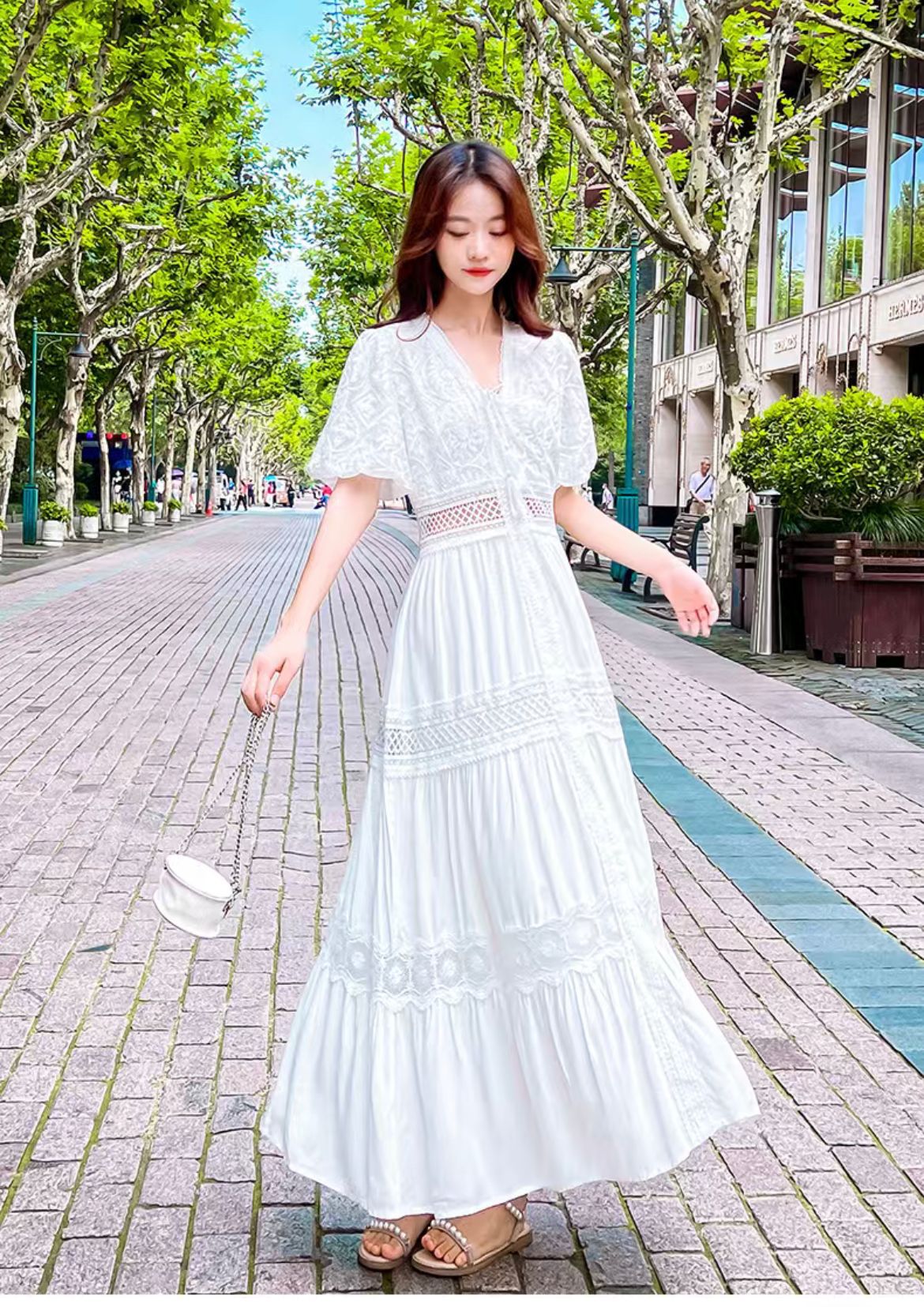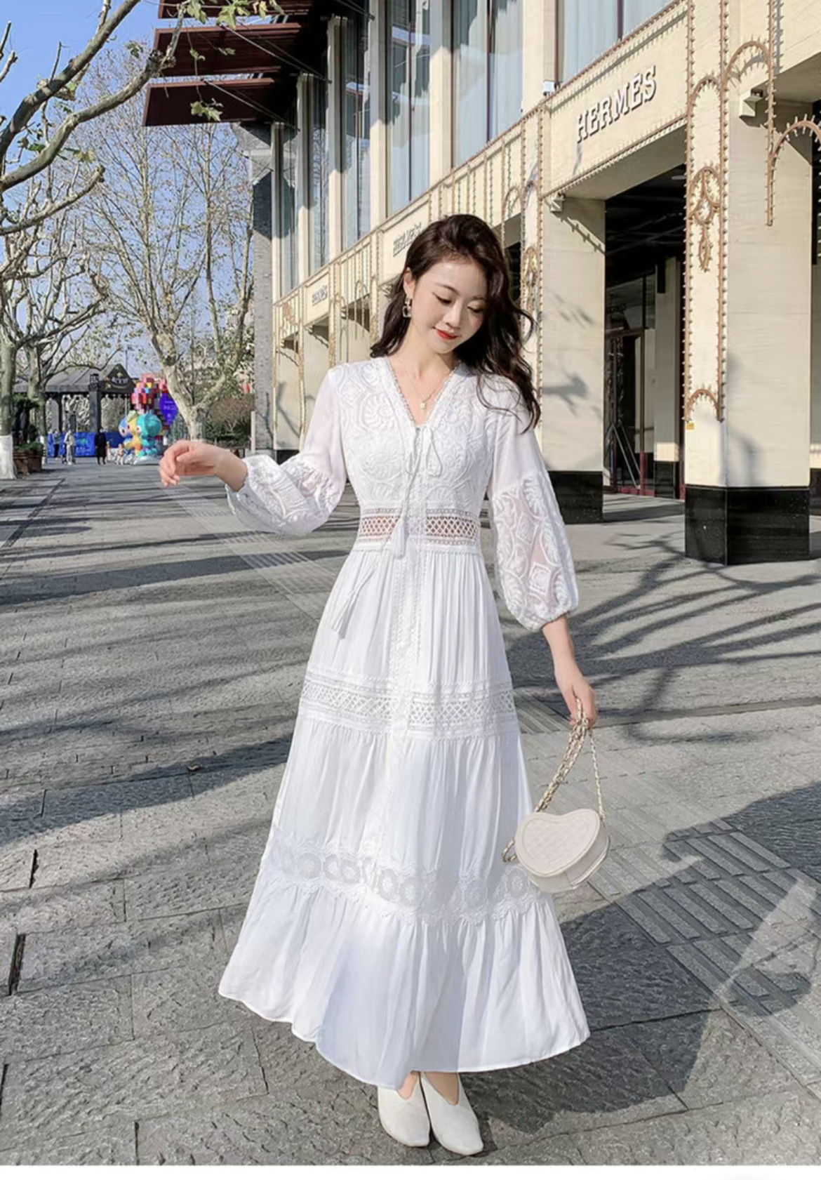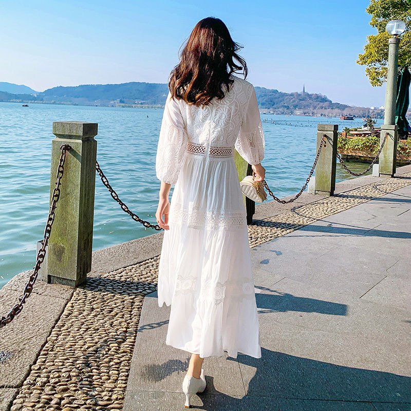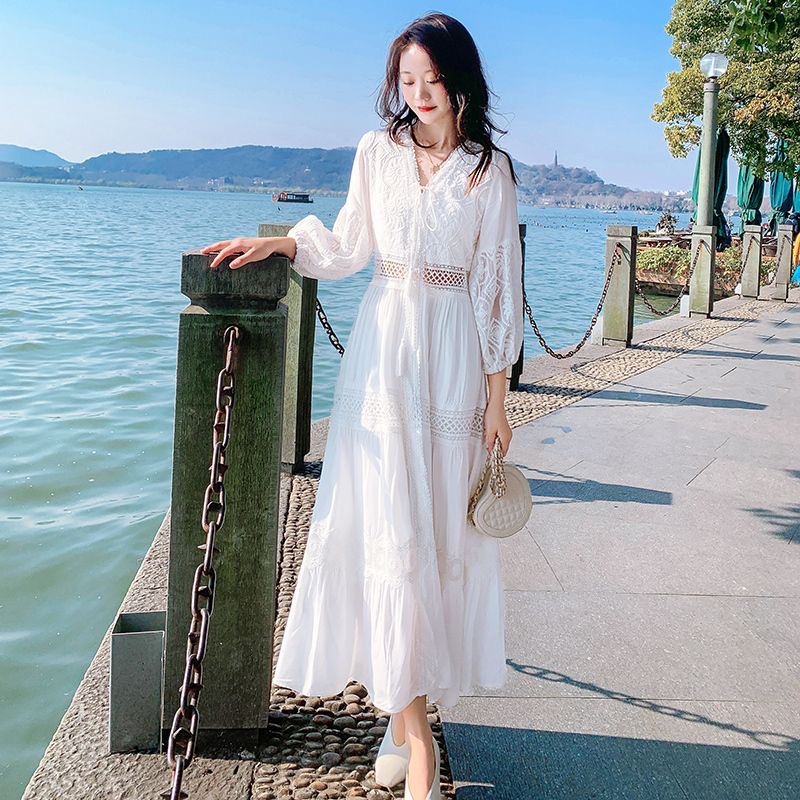 2025 인기 원피스 봄과 여름 화이트 달콤한 프렌치 퍼프 소매 긴 원피스 해변 원피스 여행 스커트스토어 가기