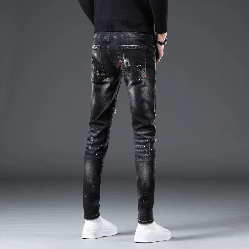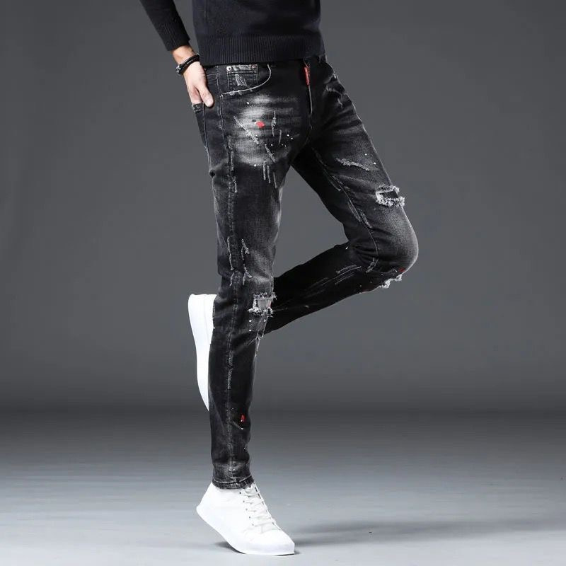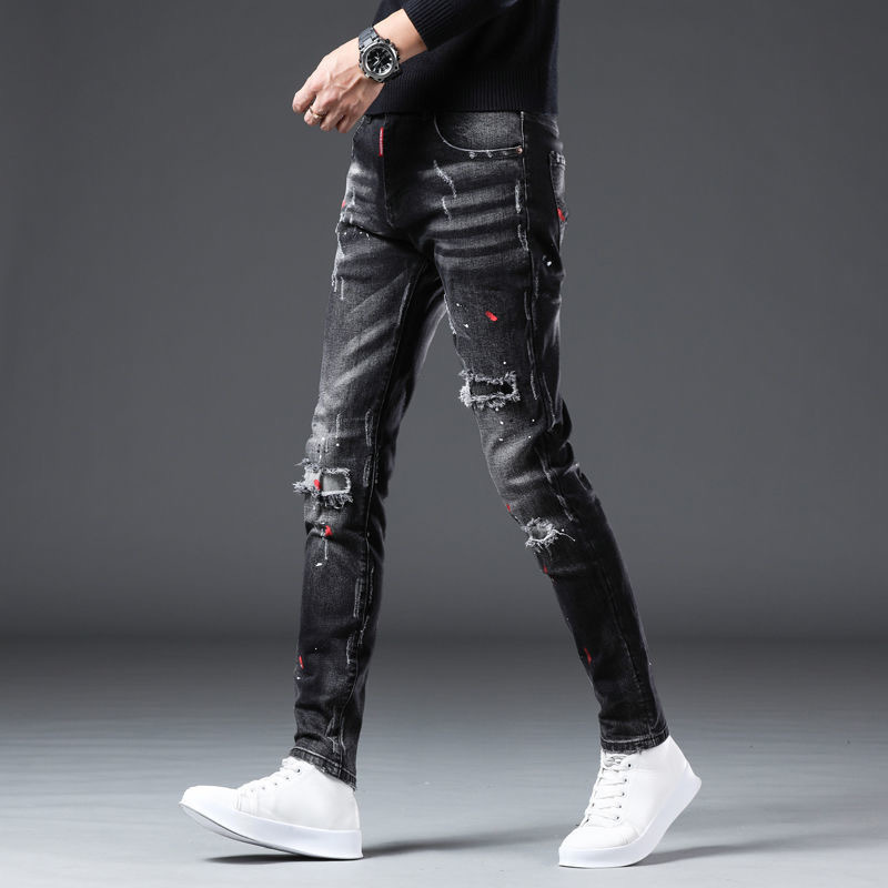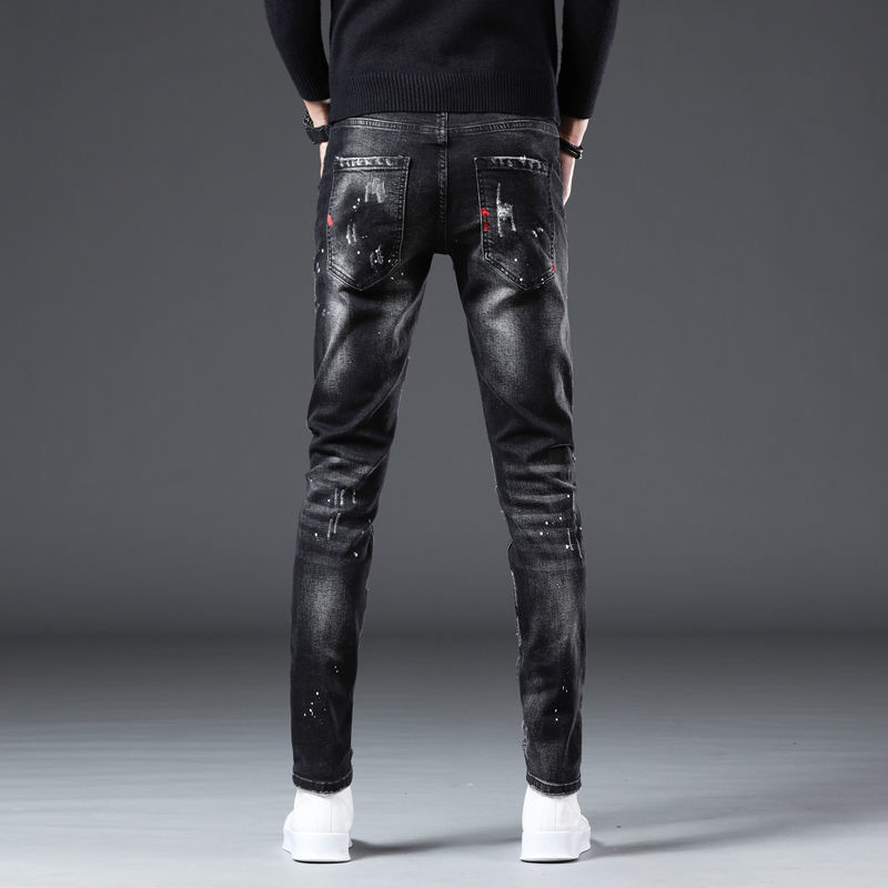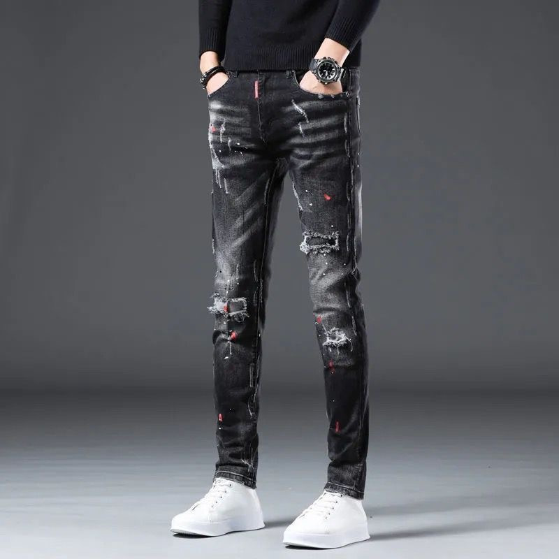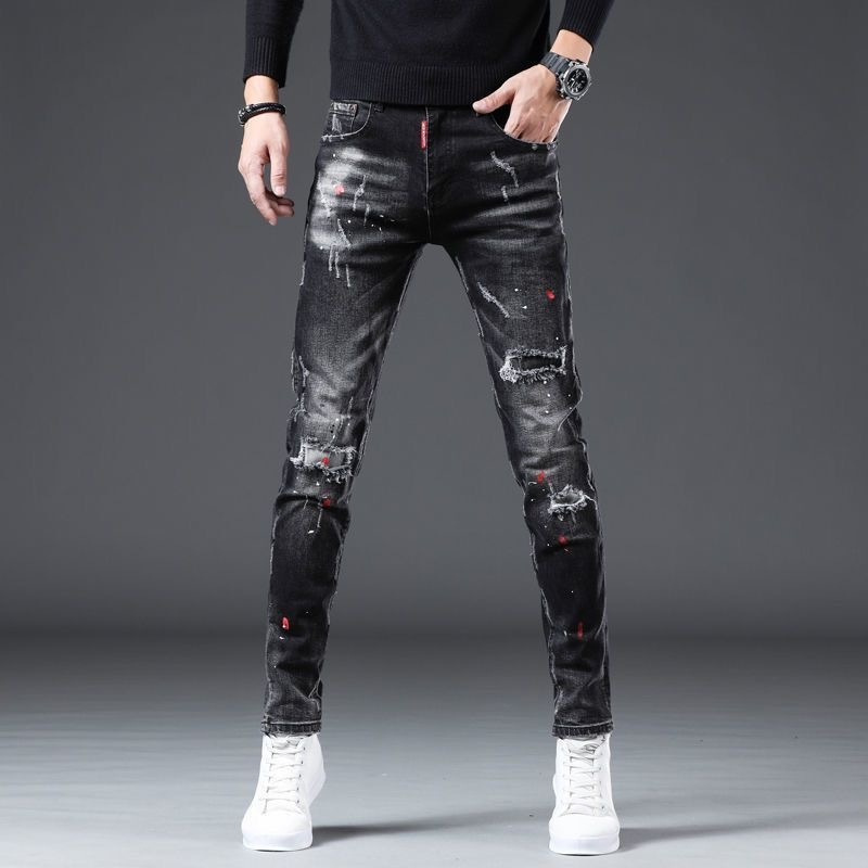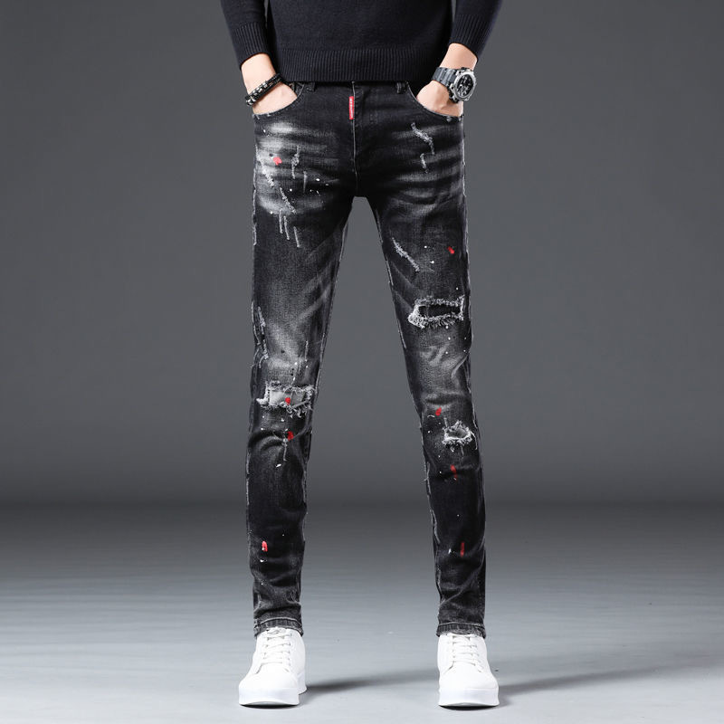 청바지 남성 한국식 트렌디 슬림핏 스키니 팬츠 트렌디 브랜드 빈티지 패치 남성 바지