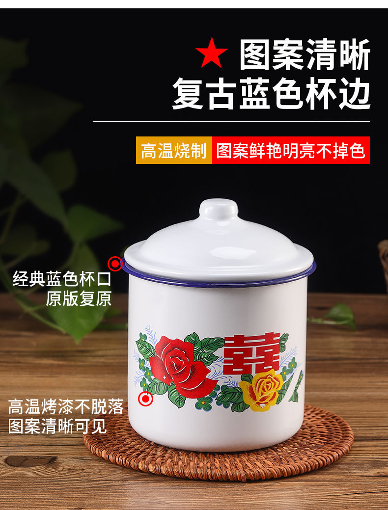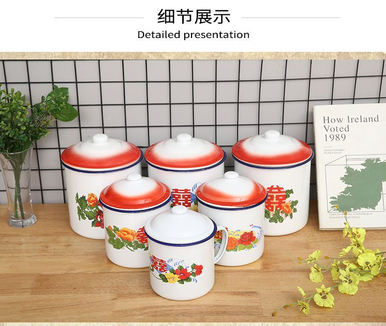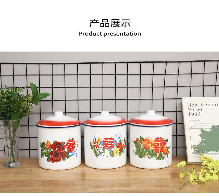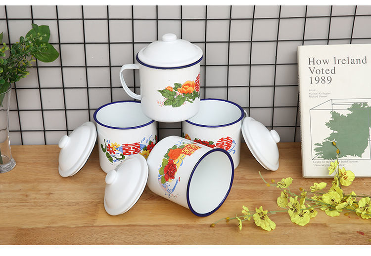 향수를 불러 일으키는 클래식 빈티지 레드 더블 행복 에나멜 컵 빨간 철 차 고치기 뚜껑 웨딩 축제 팩 빈티지 머그스토어 가기