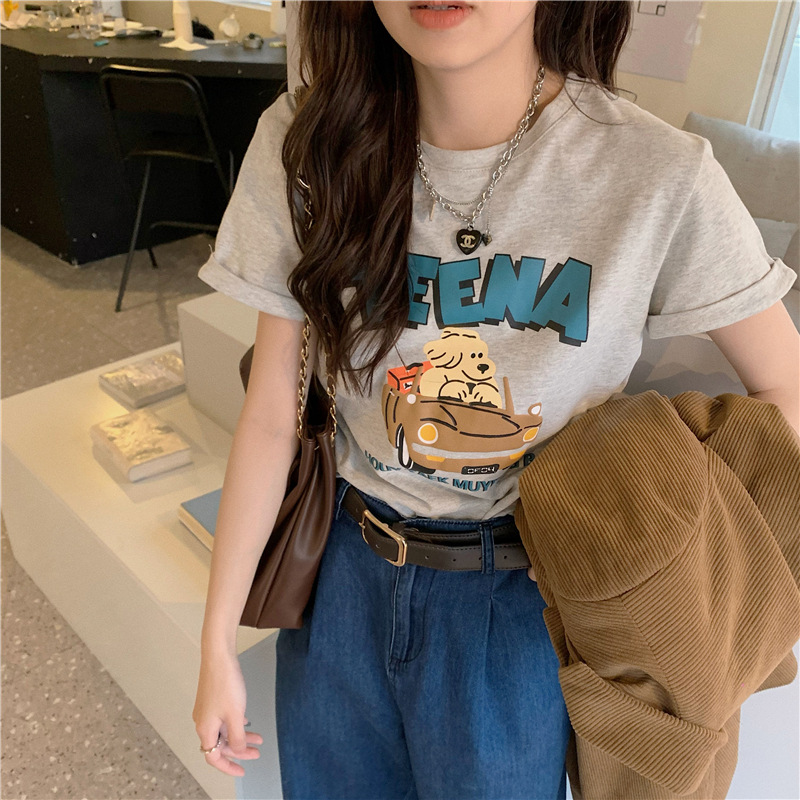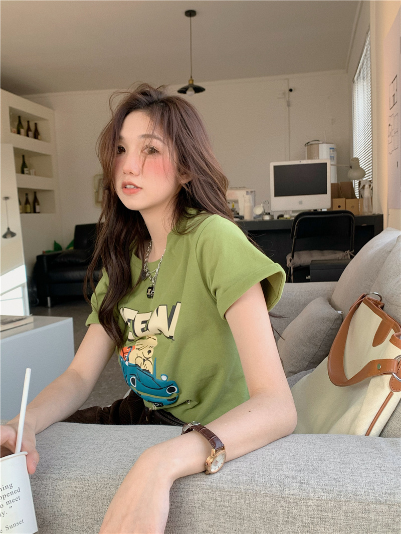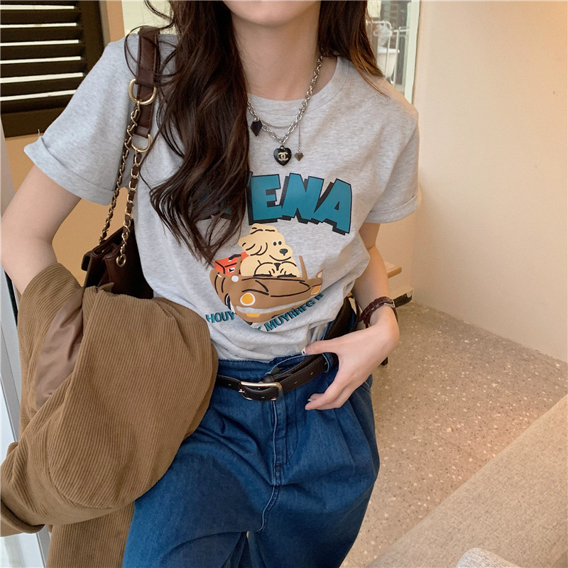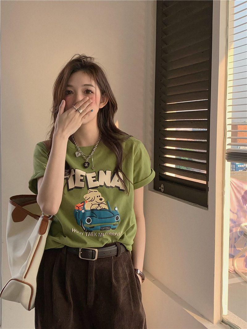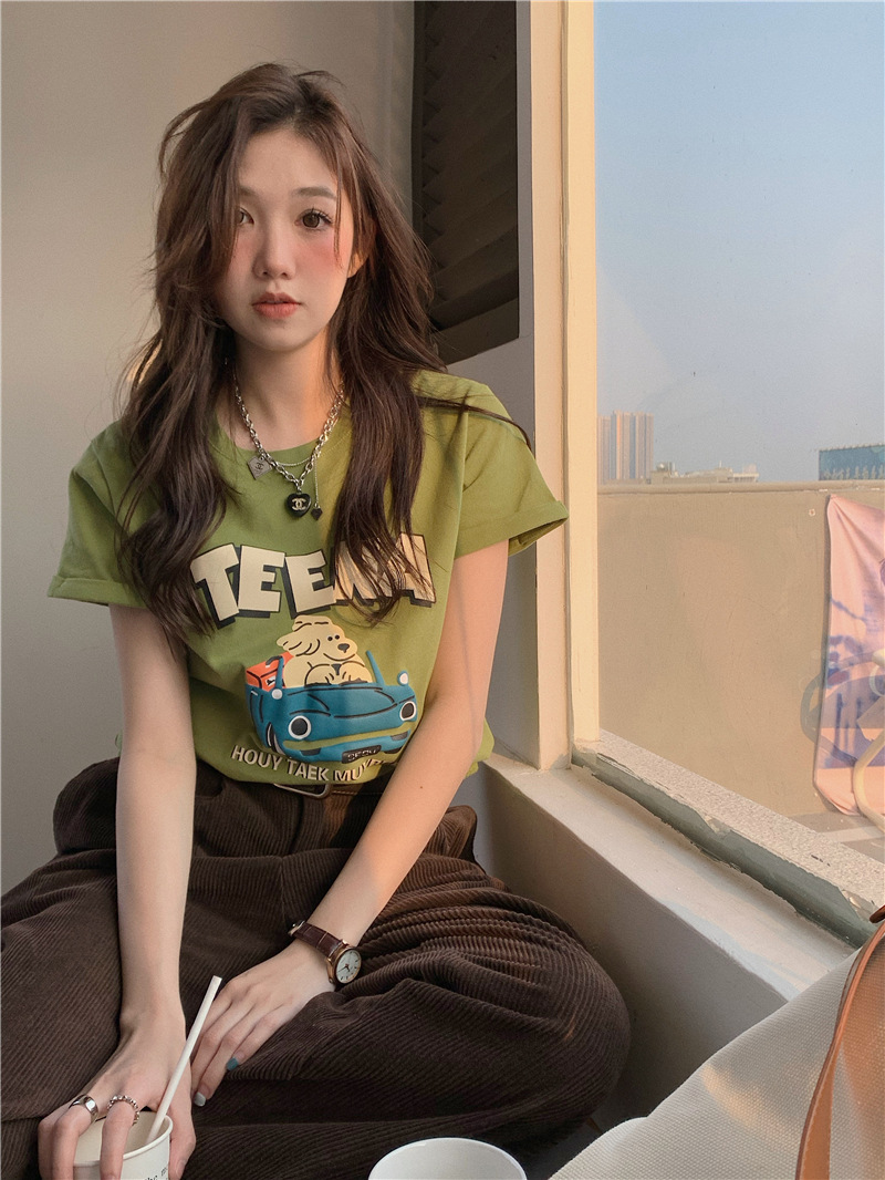 여름 2025 새로운 레트로 퓨어 코튼 반팔 티셔츠 여성용 한국 세대 디자인 프린트 캐주얼 숄더 레귤러 티셔츠 트렌디스토어 가기