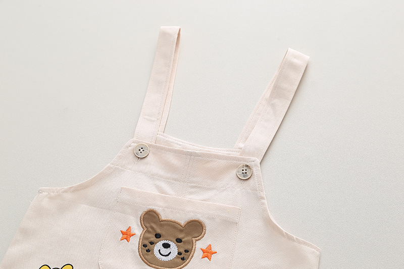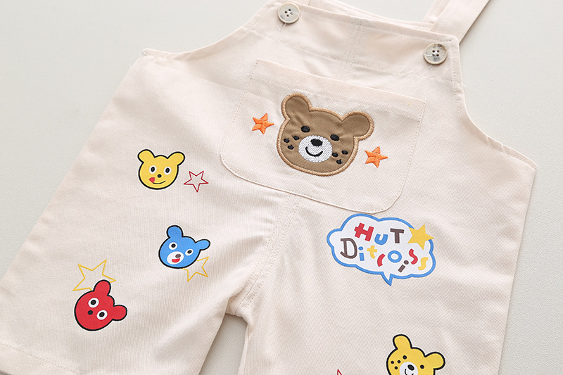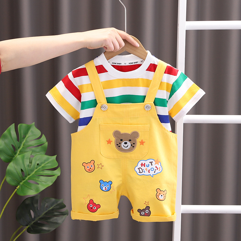 2023 트렌디 한 어린이 여름 신상품 아기 소년과 소녀 컬러 스트라이프 반팔 티셔츠 캐주얼 느슨한 만화 멜빵 세트스토어 가기