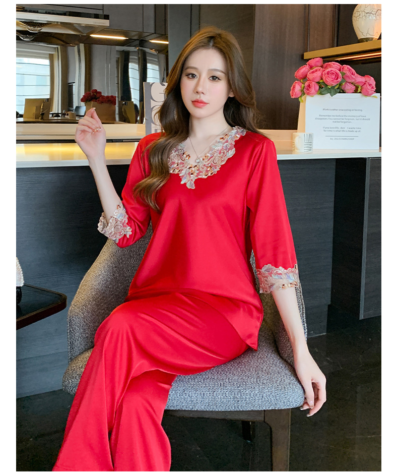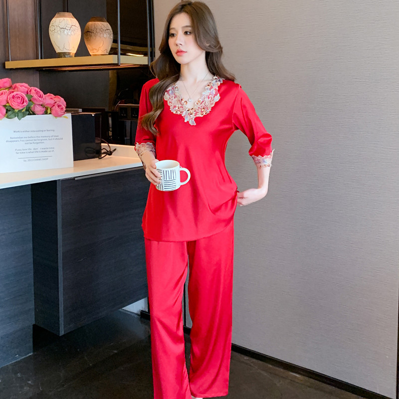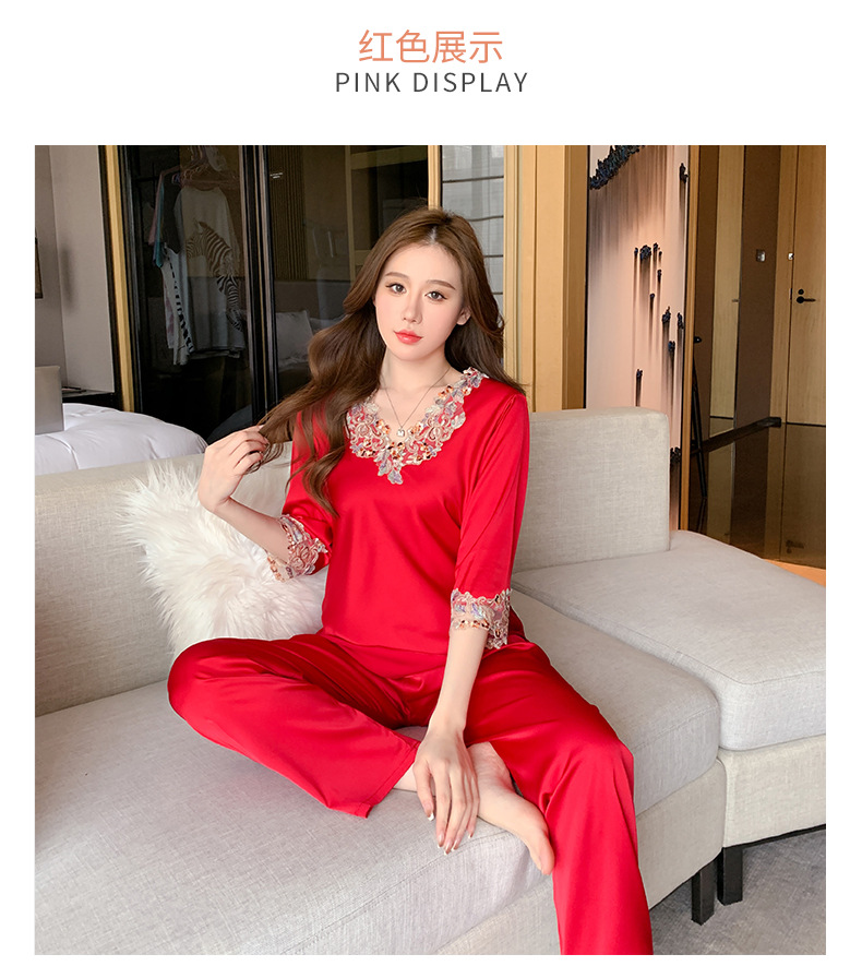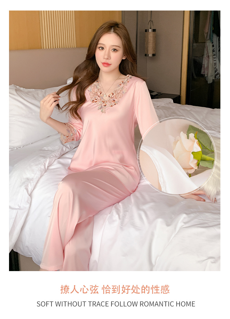 잠옷 여자의 봄과 가을 실키 새틴 긴 소매 여자의 잠옷 가정 옷 세트 섹시한 다채로운 레이스 하이 엔드 감각
