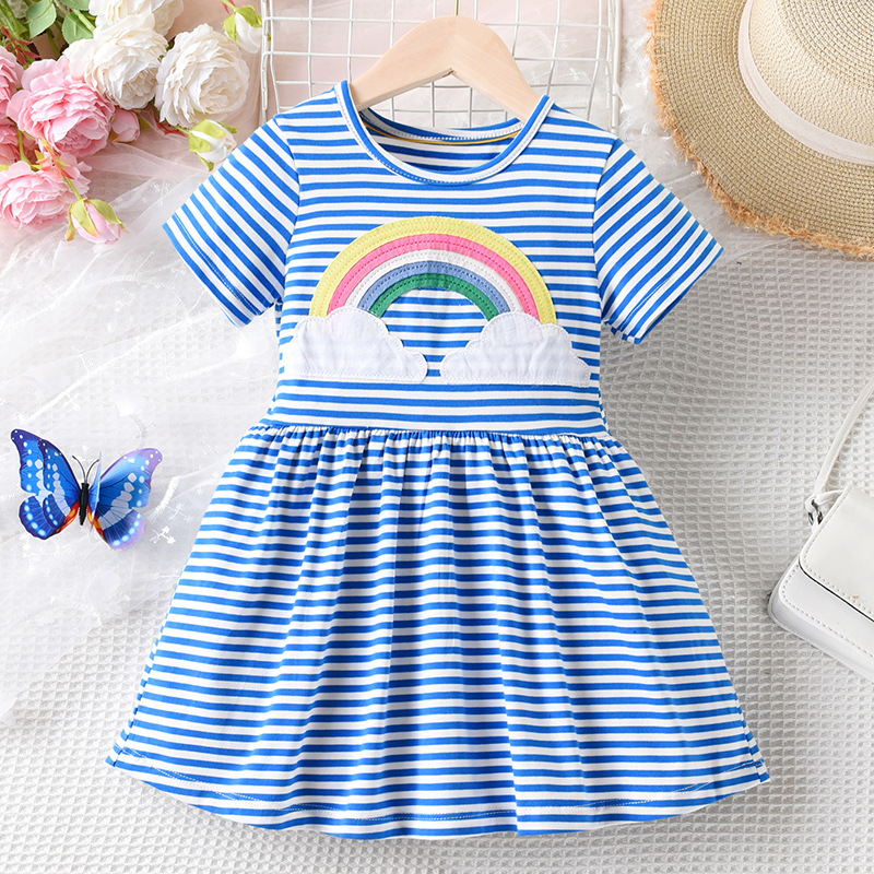 여아 반팔 스트라이프 원피스 여름 2023 새로운 소녀의 세련된 레인보우 패치 공주 원피스 캐주얼 아동복스토어 가기