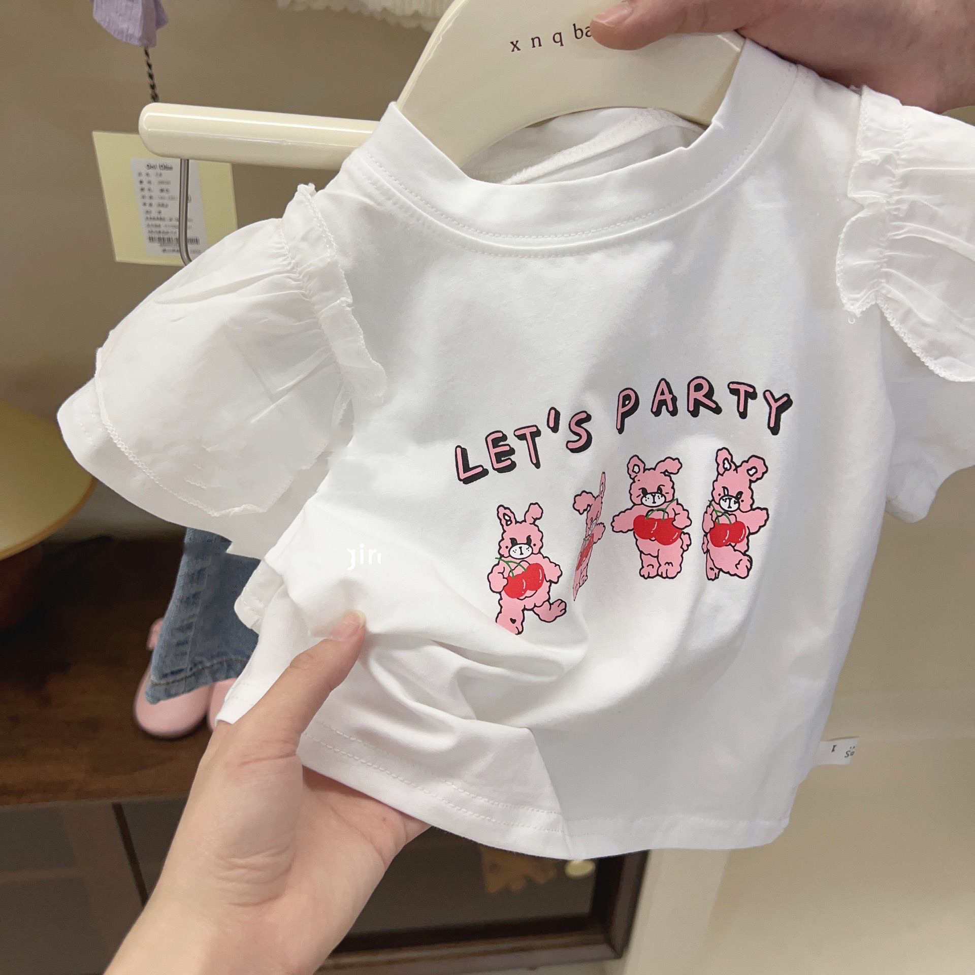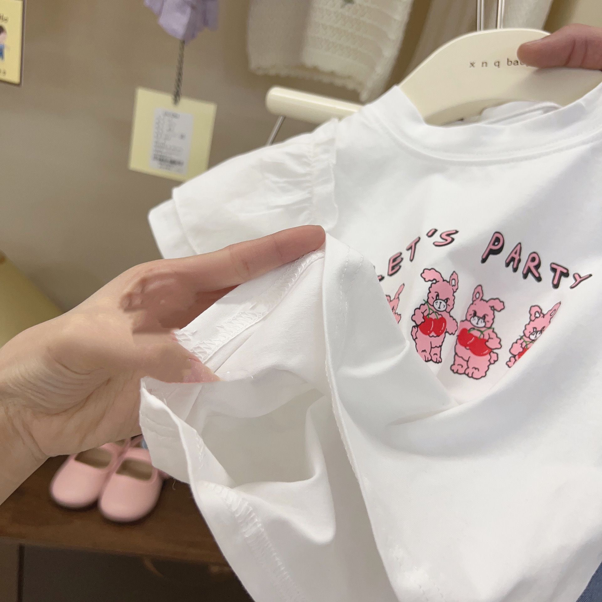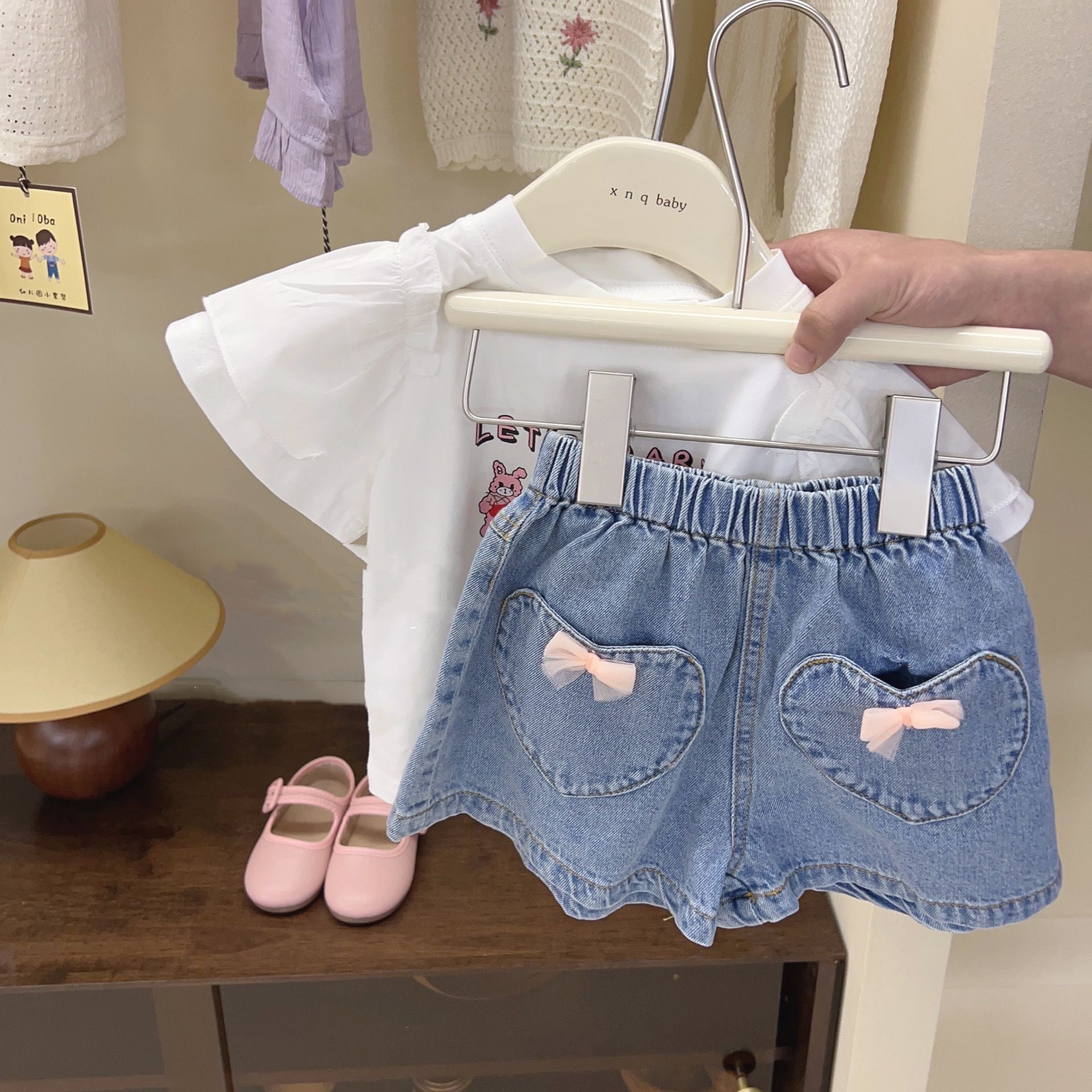 女童夏装2023新款韩系儿童卡通百搭纯棉小飞袖上衣洋气牛仔短裤潮