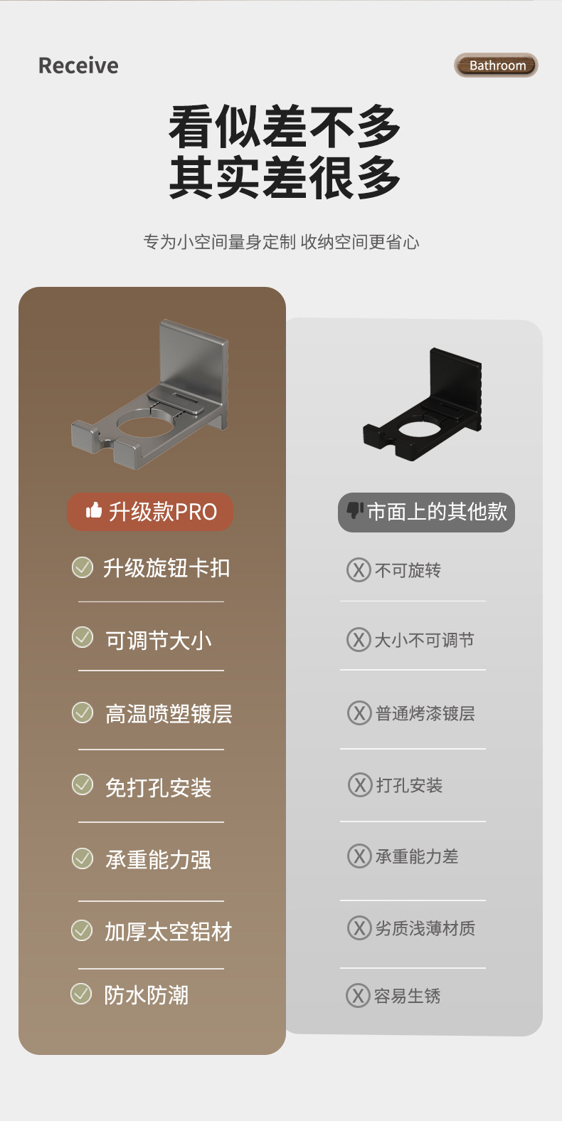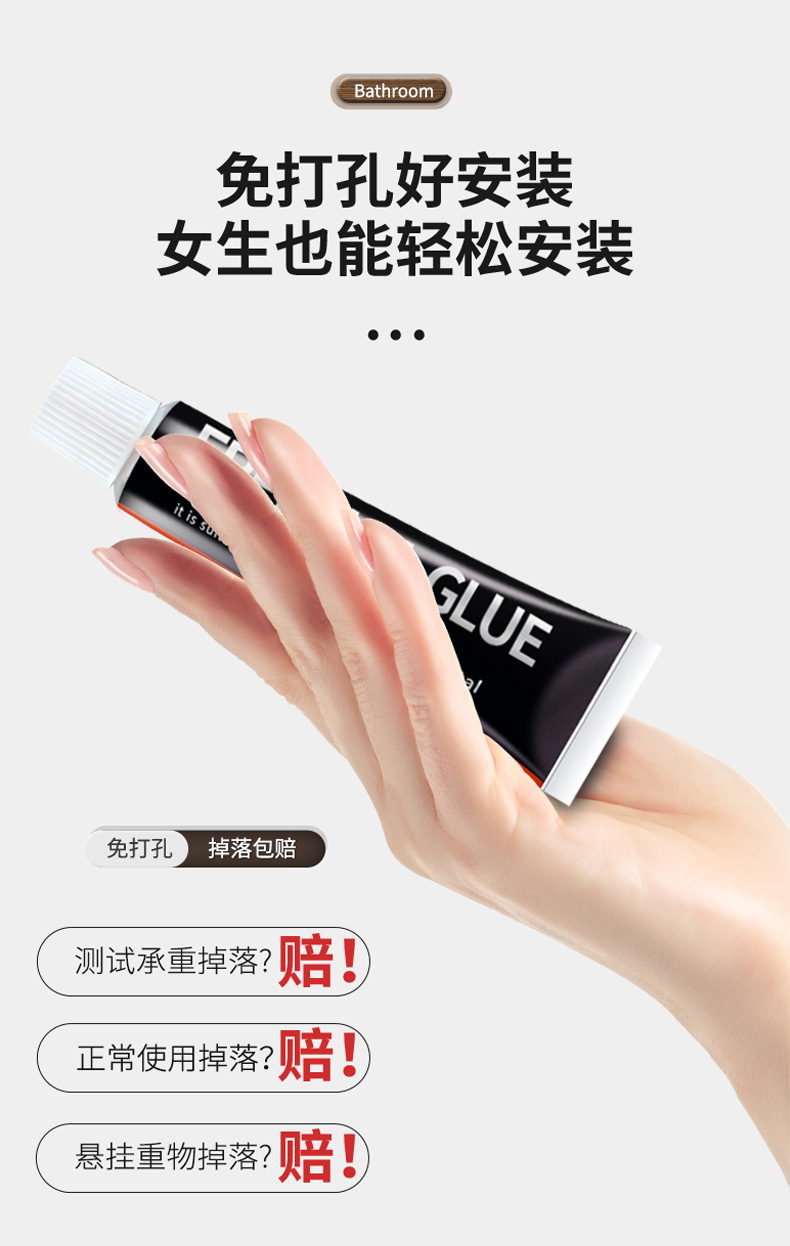 (2)免打孔安装请注意,墙面需平整坚固的玻璃瓷砖等。不可用在粉刷墙,墙纸,石灰墙等不平整不坚固的墙面上。涂胶上墙后需等待3-5天,免钉胶完全干透再使用!