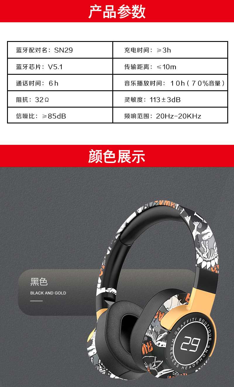 국경을 넘는 인기 제품 컬러풀한 SN29 헤드셋 블루투스 이어폰 중저음 강화 완전 밀폐형 무선 스포츠 이어폰 제조업체