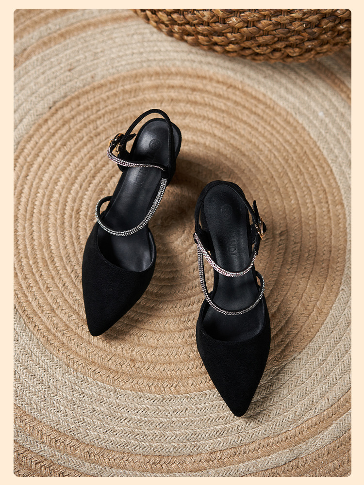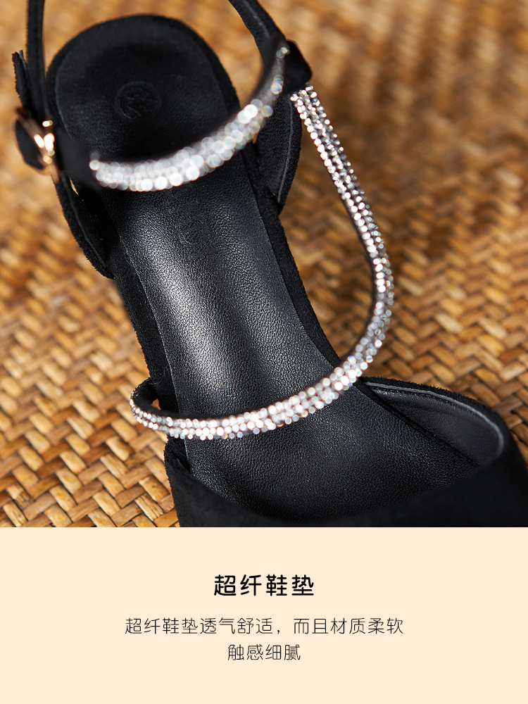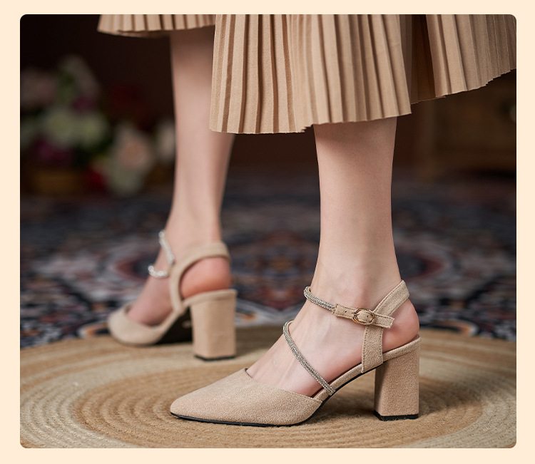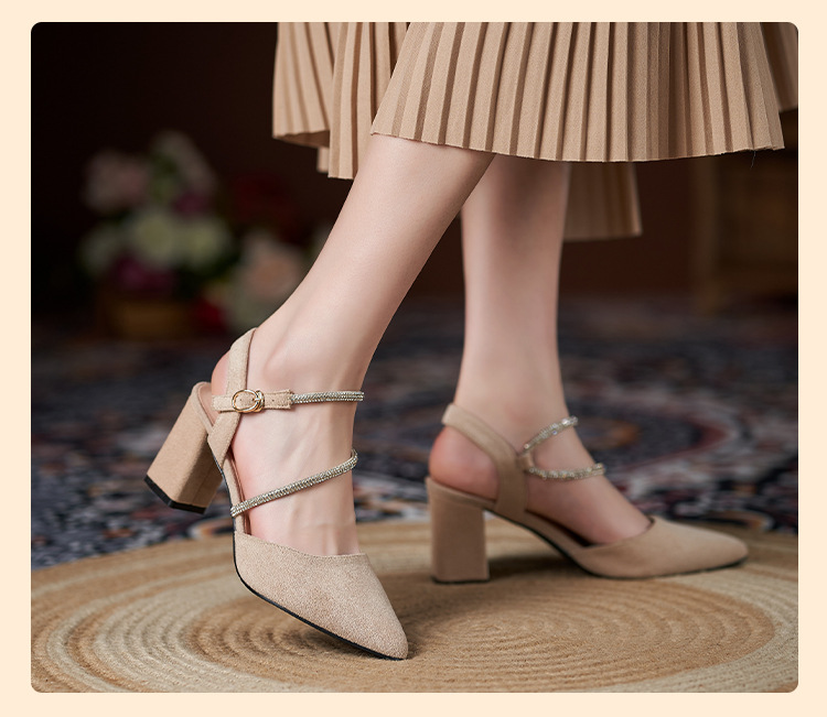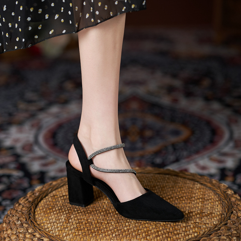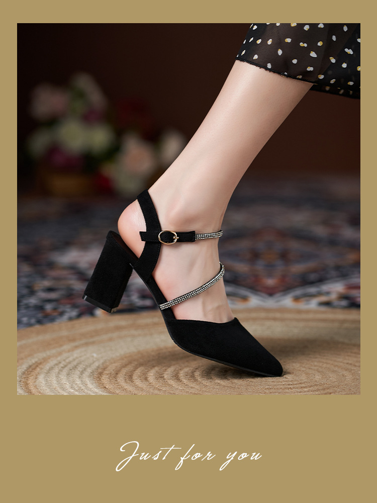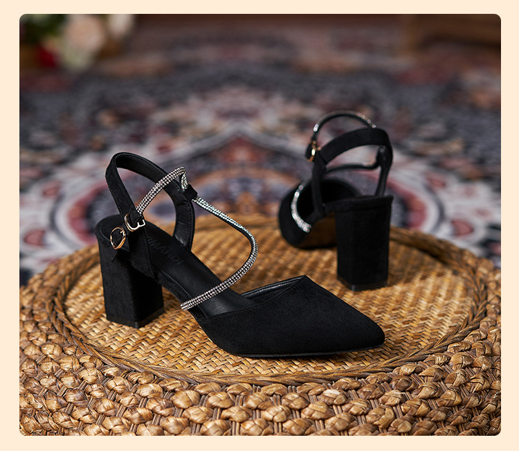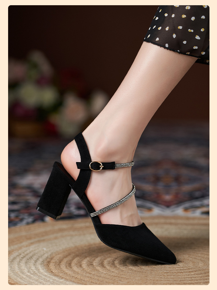 여름 새로운 뾰족한 두꺼운 굽 하이힐 플러스 사이즈 버클 라인 석 후면 빈 샌들 여성의 스몰 사이즈 모든 경기 편안한스토어 가기