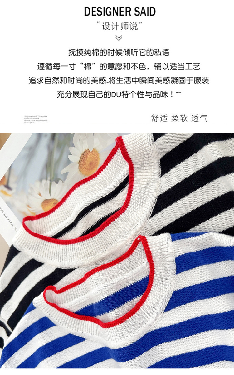 이 Y를 입력해야합니다! 상쾌한 블루와 화이트 스트라이프 루즈한 라운드 넥 소울 셔츠 코튼 니트 셔츠 여성용 봄과 여름 얇은 티셔츠스토어 가기