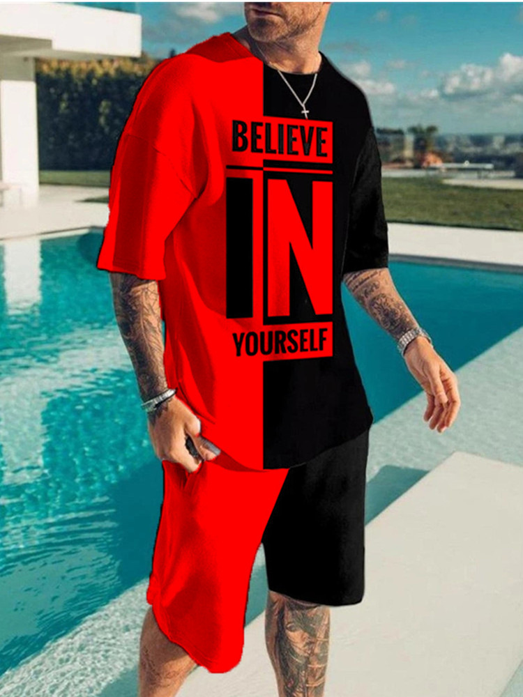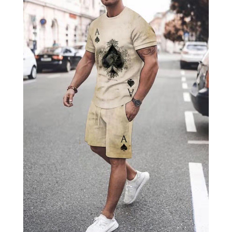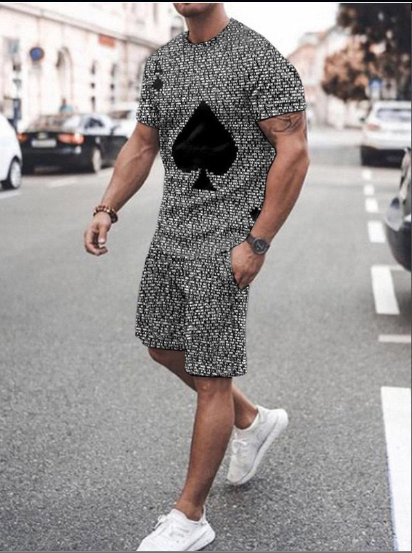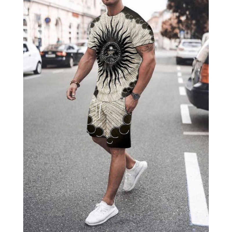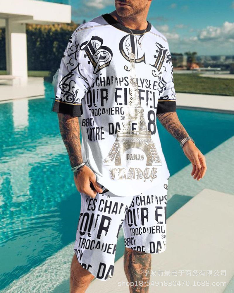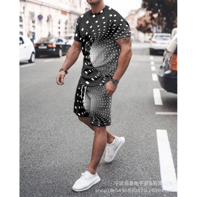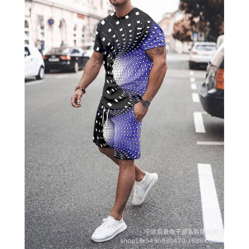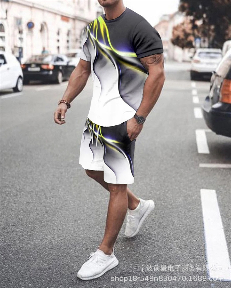 2023 AliExpress 여름 유럽과 미국 3D 남성 세트 디지털 인쇄 반팔 반바지 패션 스포츠 투피스 세트