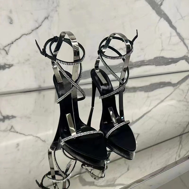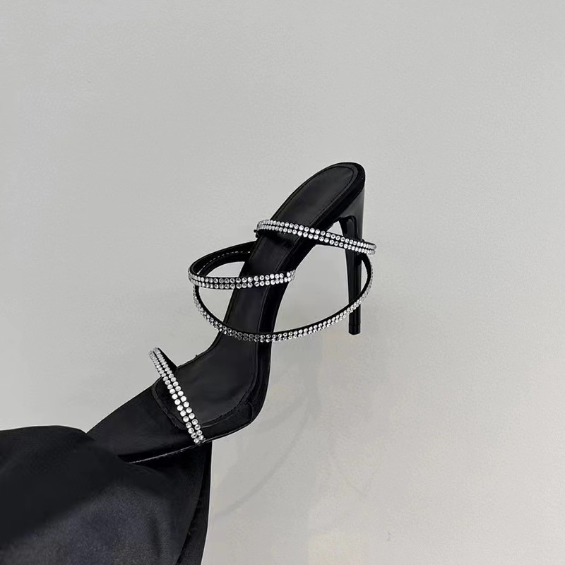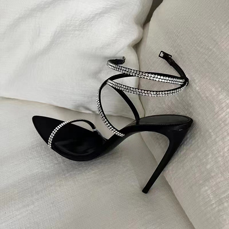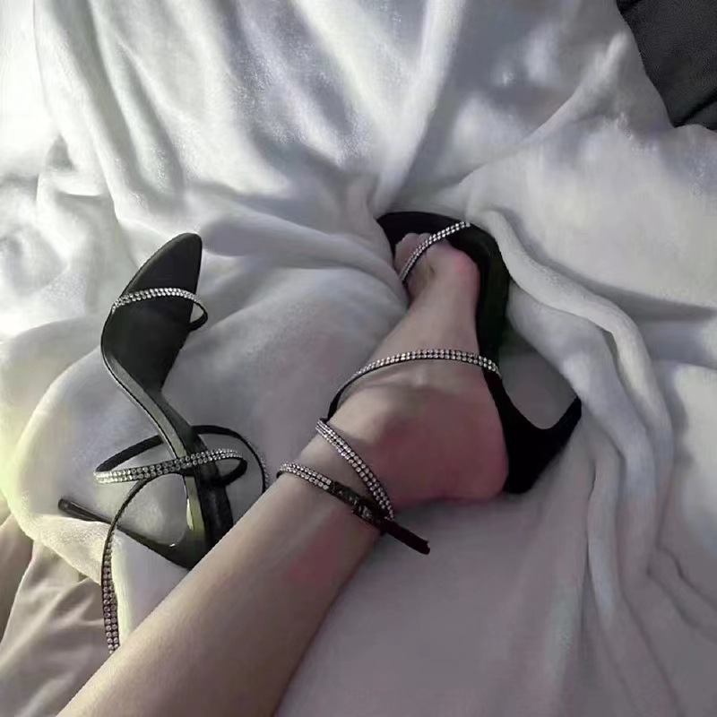 굽 높은 신발 봄 새 발가락 뾰족한 모조 다이아몬드 크로스 버클 중공 섹시 사교계 스틸레토 힐 샌들 여성