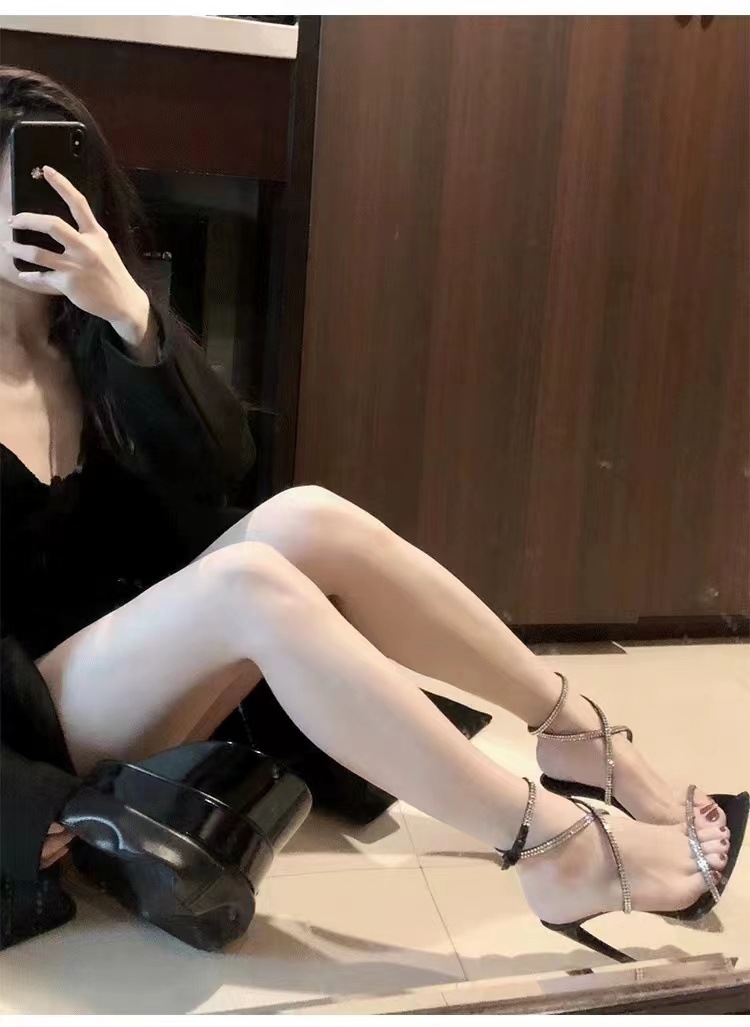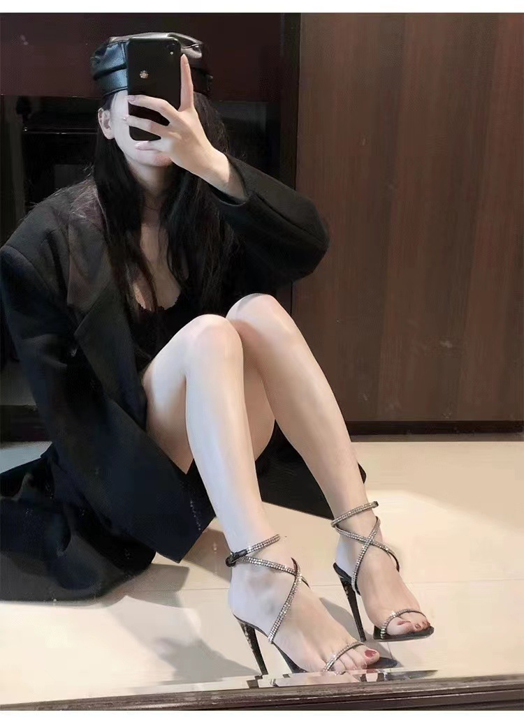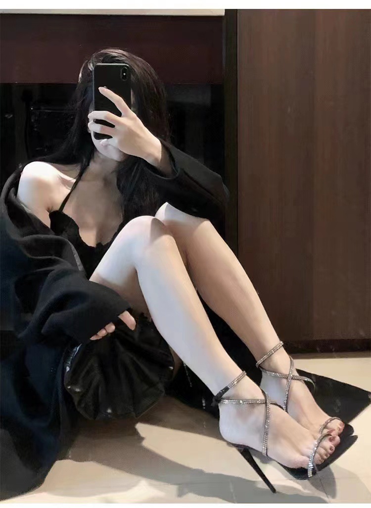 굽 높은 신발 봄 새 발가락 뾰족한 모조 다이아몬드 크로스 버클 중공 섹시 사교계 스틸레토 힐 샌들 여성스토어 가기