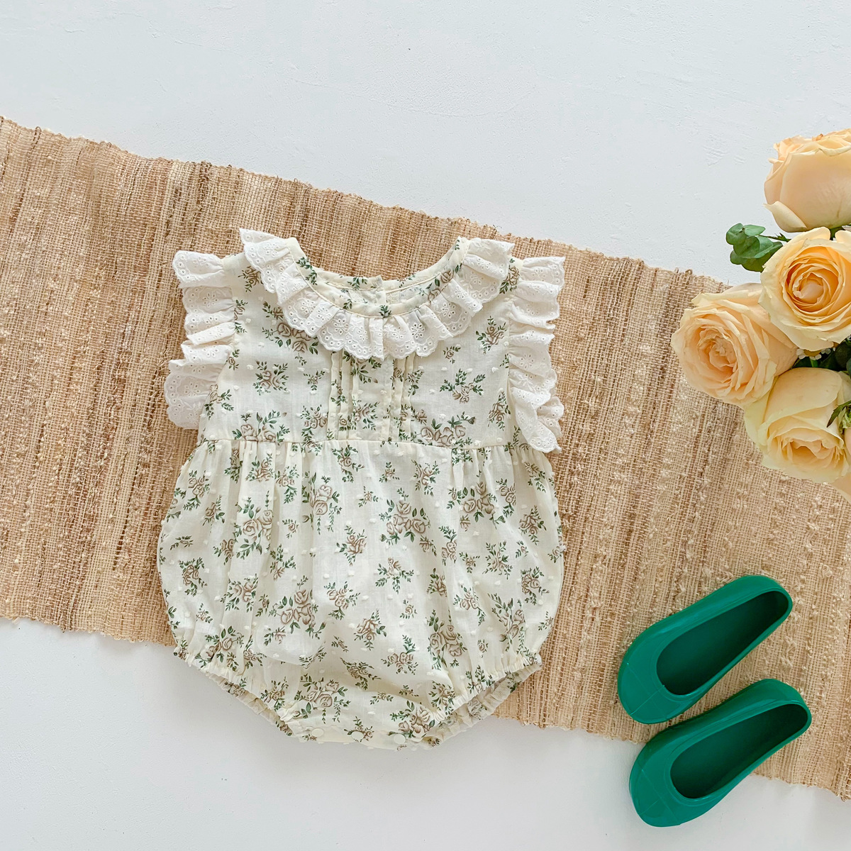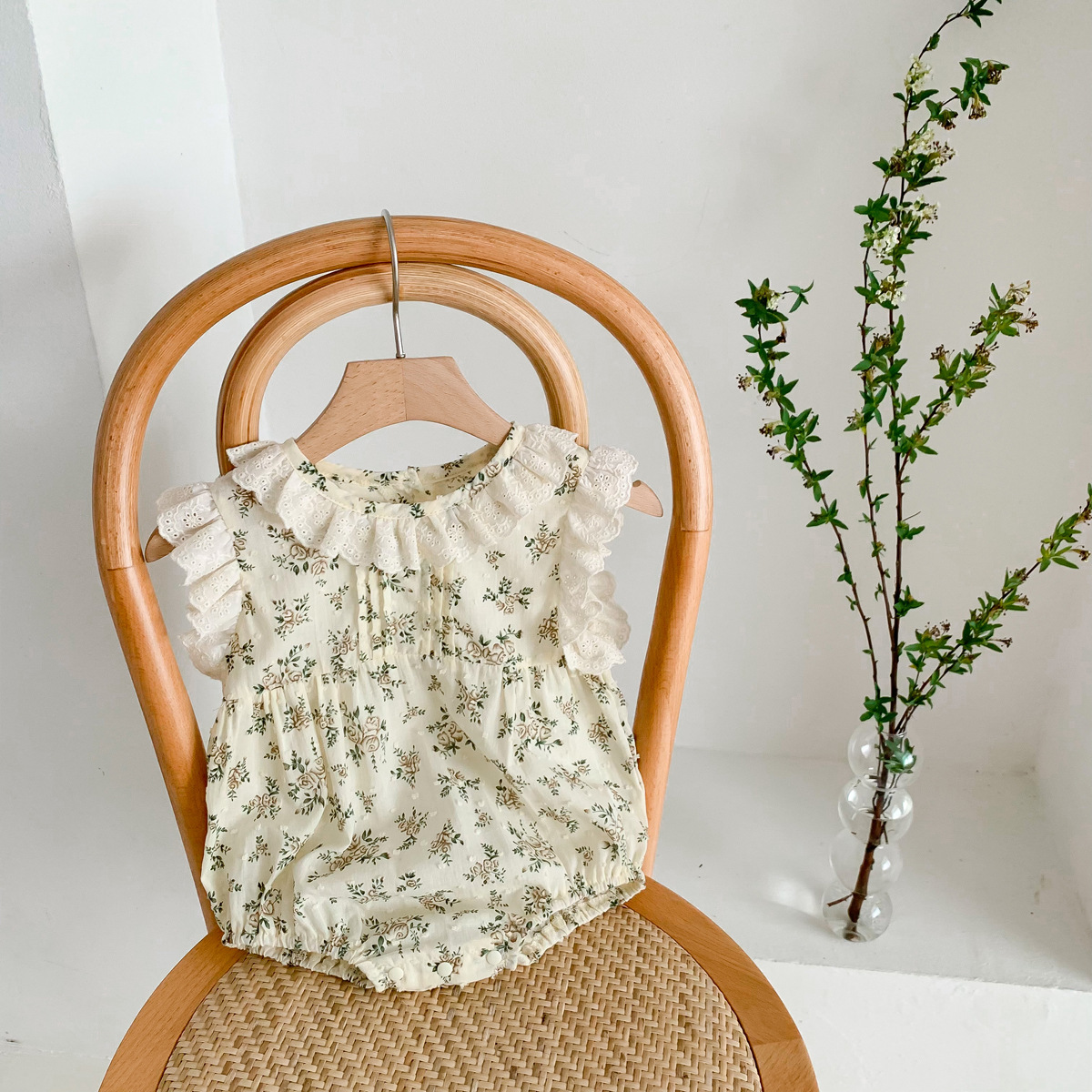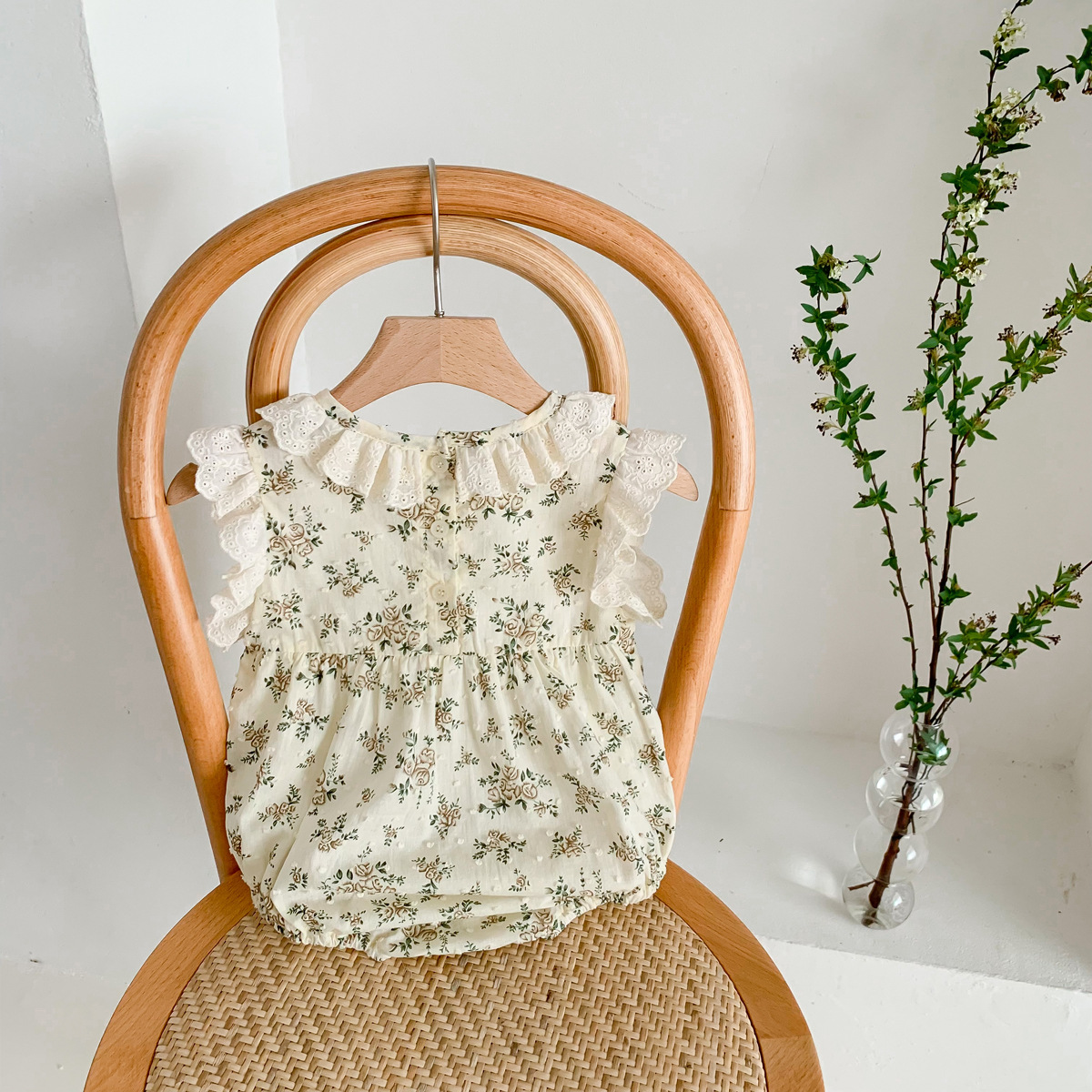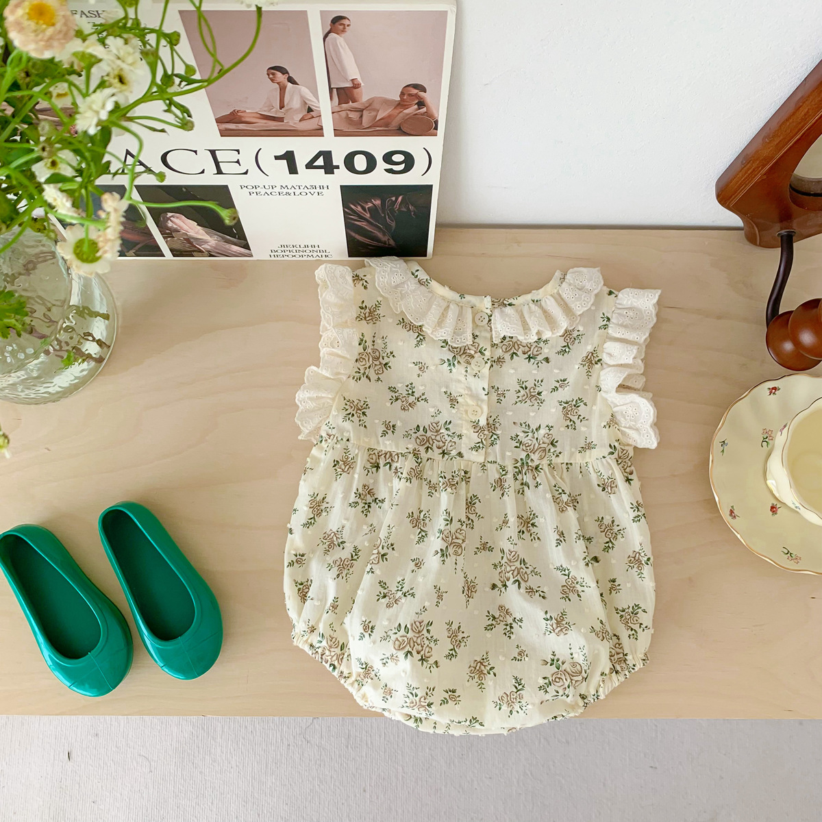 여자의 빈티지 꽃 hassel 아기 소녀의 여름 얇은 레이스 비행 소매 귀여운 점프 슈트