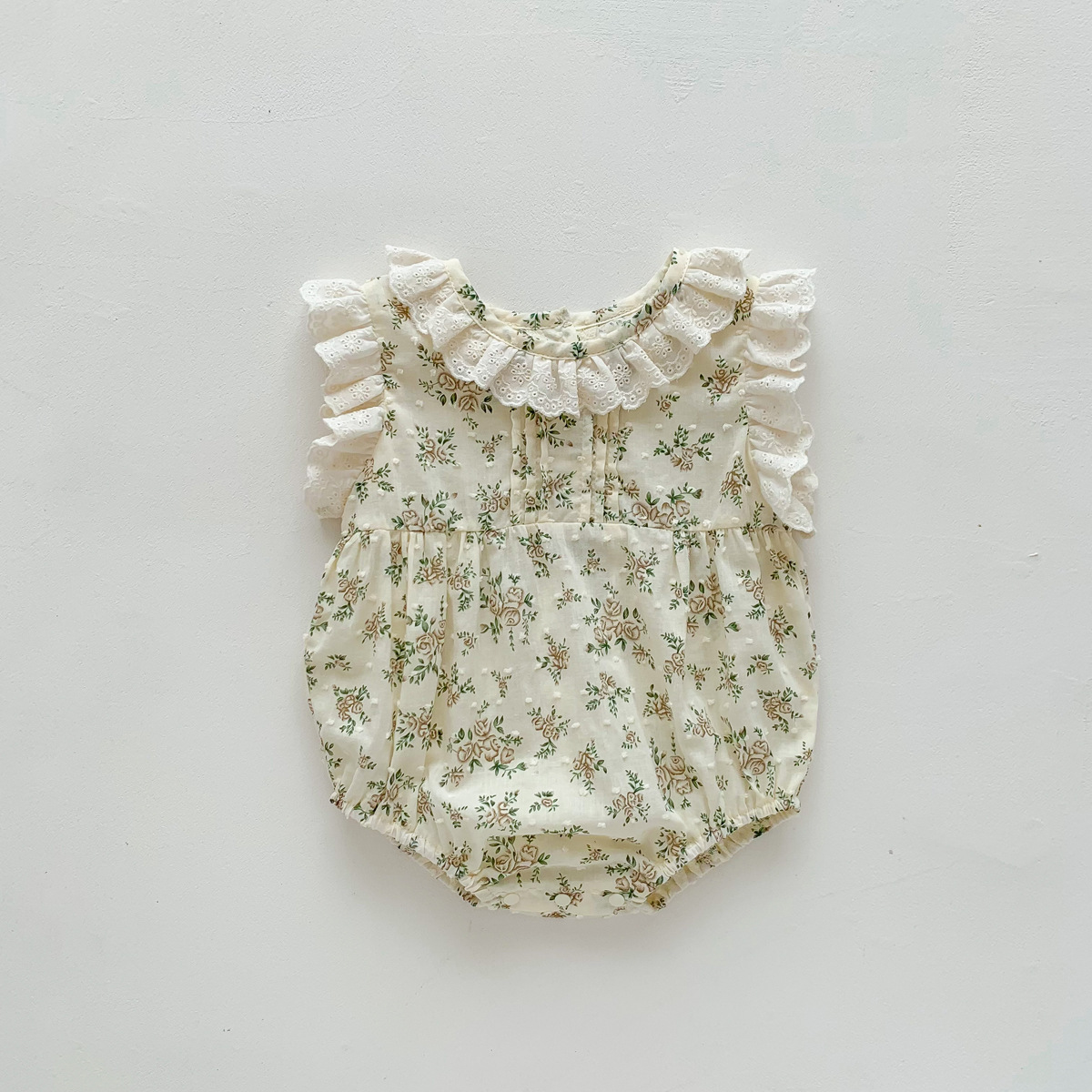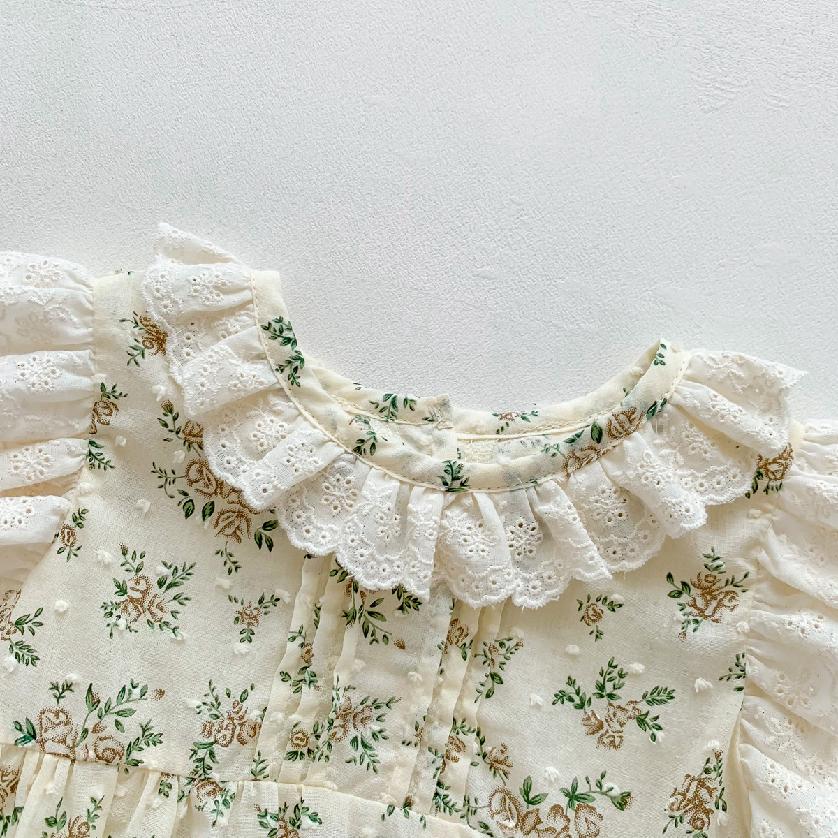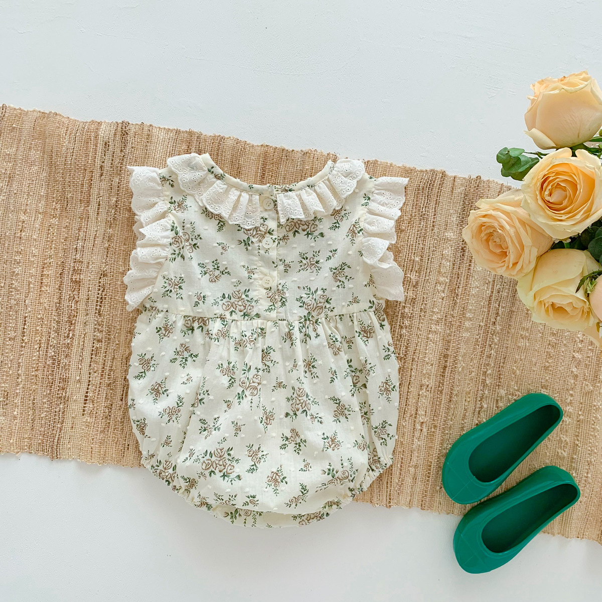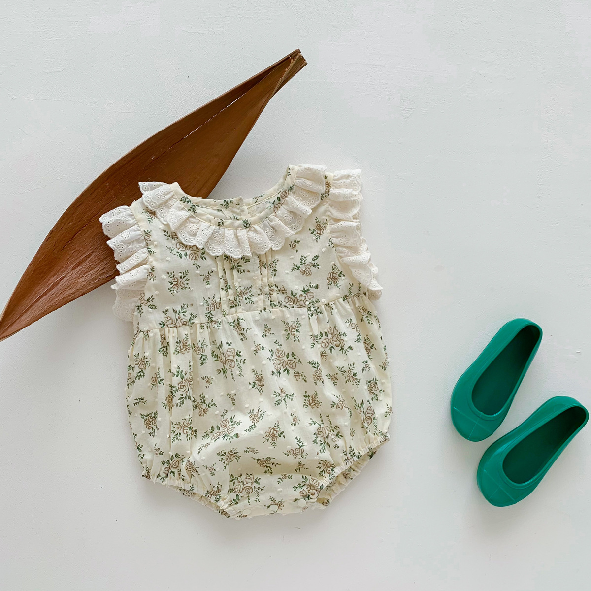 여자의 빈티지 꽃 hassel 아기 소녀의 여름 얇은 레이스 비행 소매 귀여운 점프 슈트