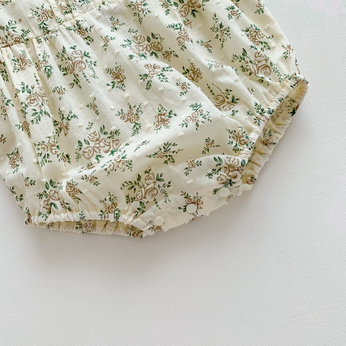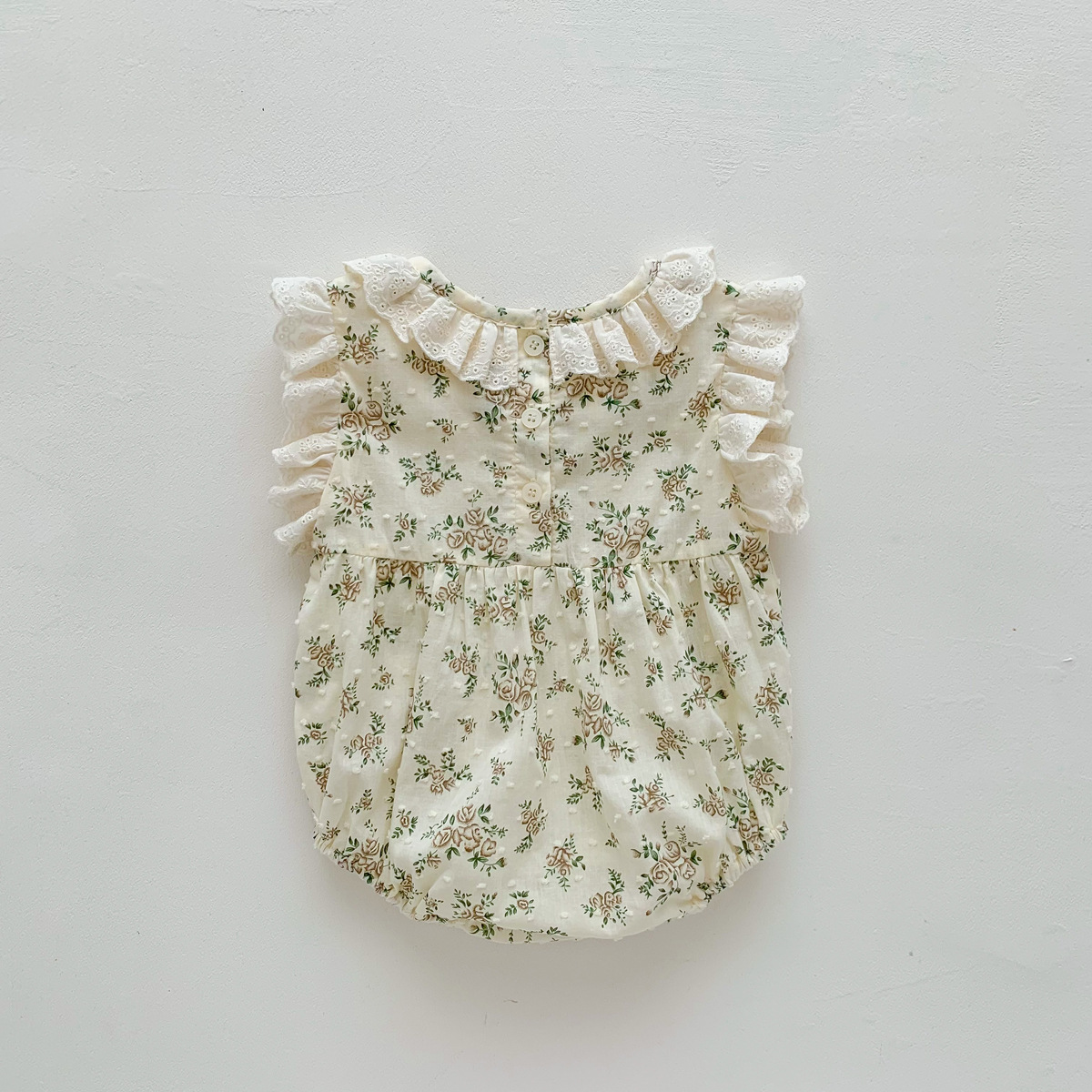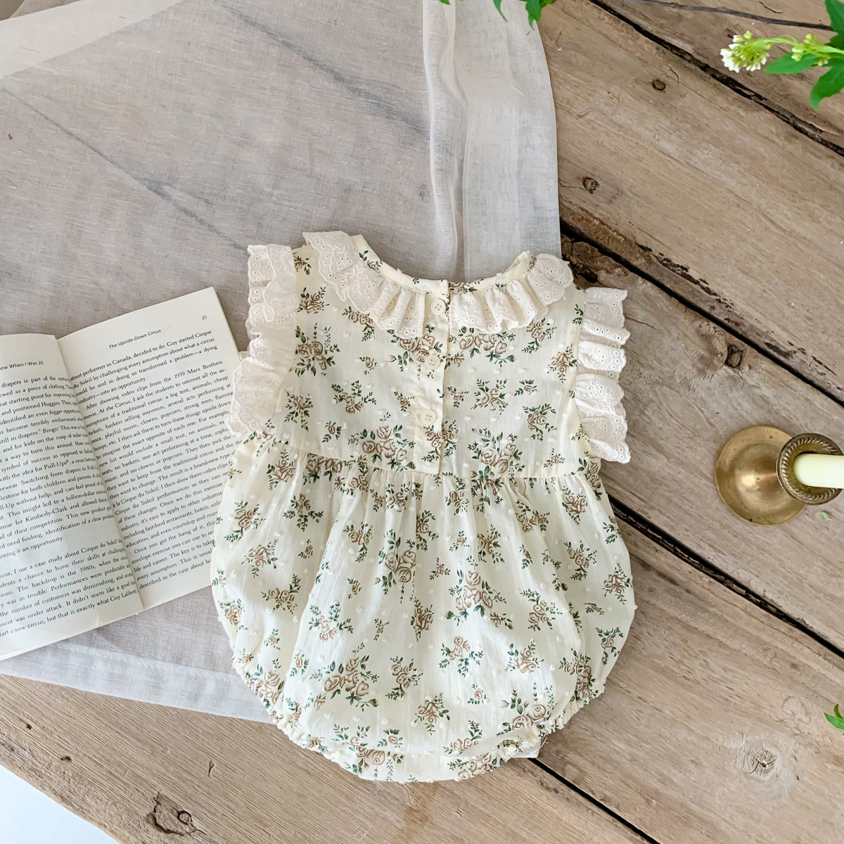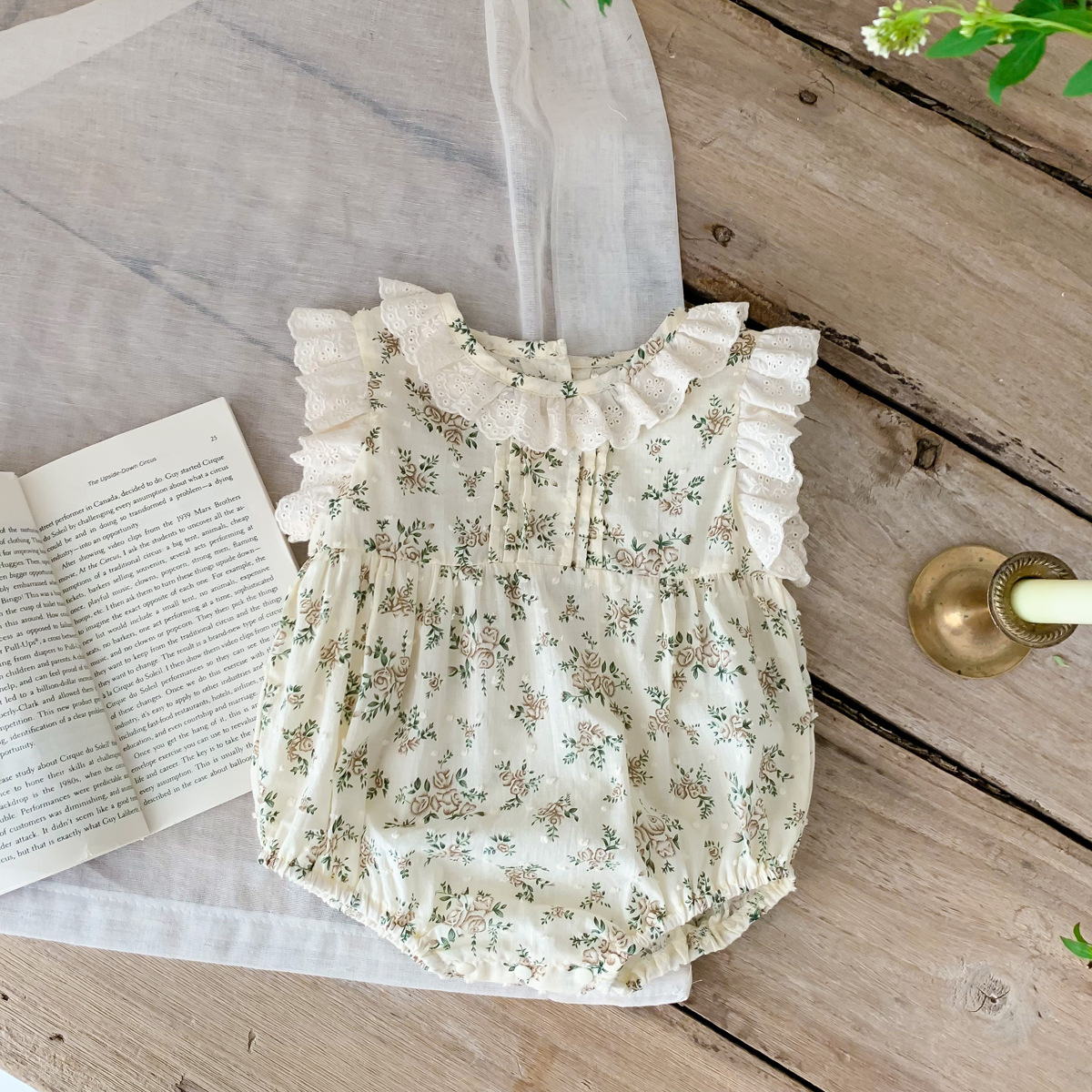 여자의 빈티지 꽃 hassel 아기 소녀의 여름 얇은 레이스 비행 소매 귀여운 점프 슈트