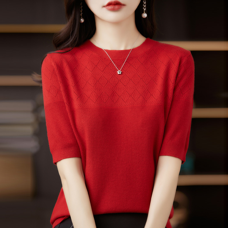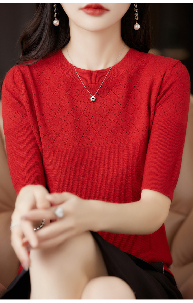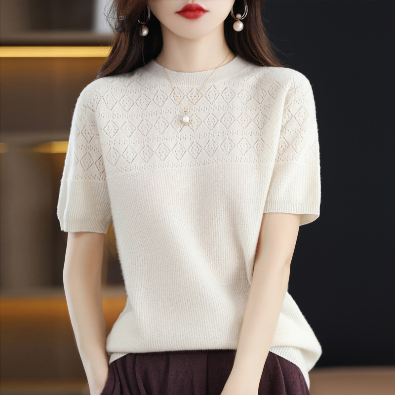 니트 티셔츠 여성 여름 2022 새로운 라운드 넥 마름모 중공 반팔 여성 패션 니트 하프 슬리브 숙녀상의