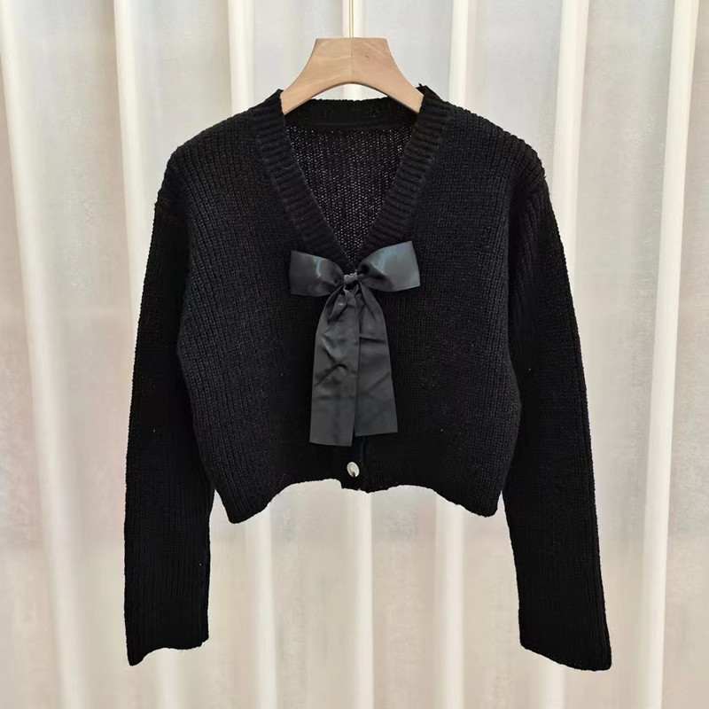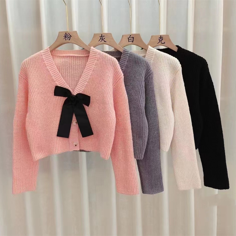 부드러운 스타일의 리본 핑크 스웨터 재킷 여성용 가을 겨울 2025 신상품 작은 사이즈 짧은 브이넥 니트 가디건스토어 가기