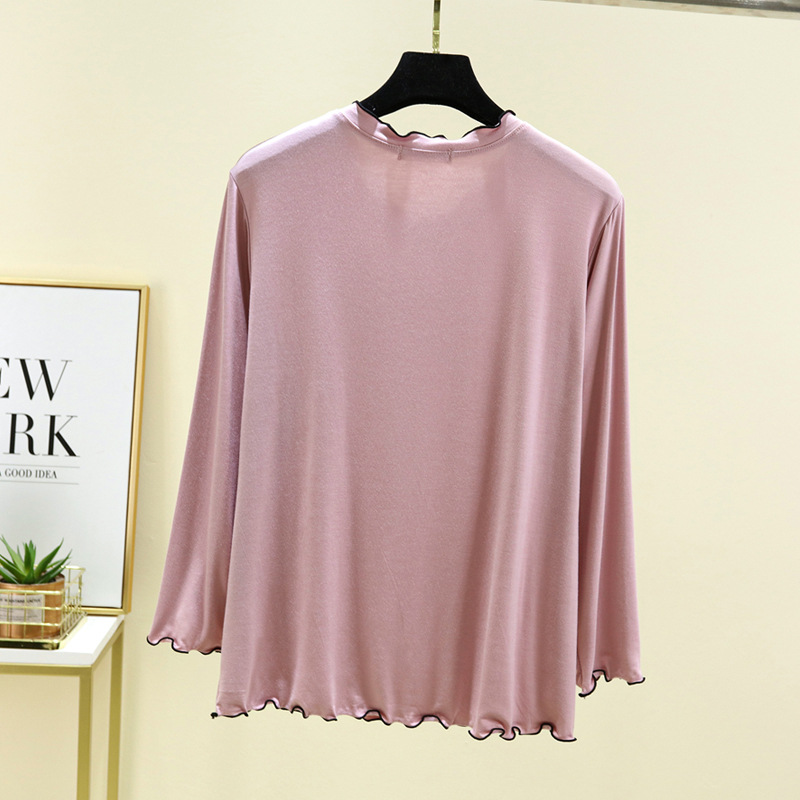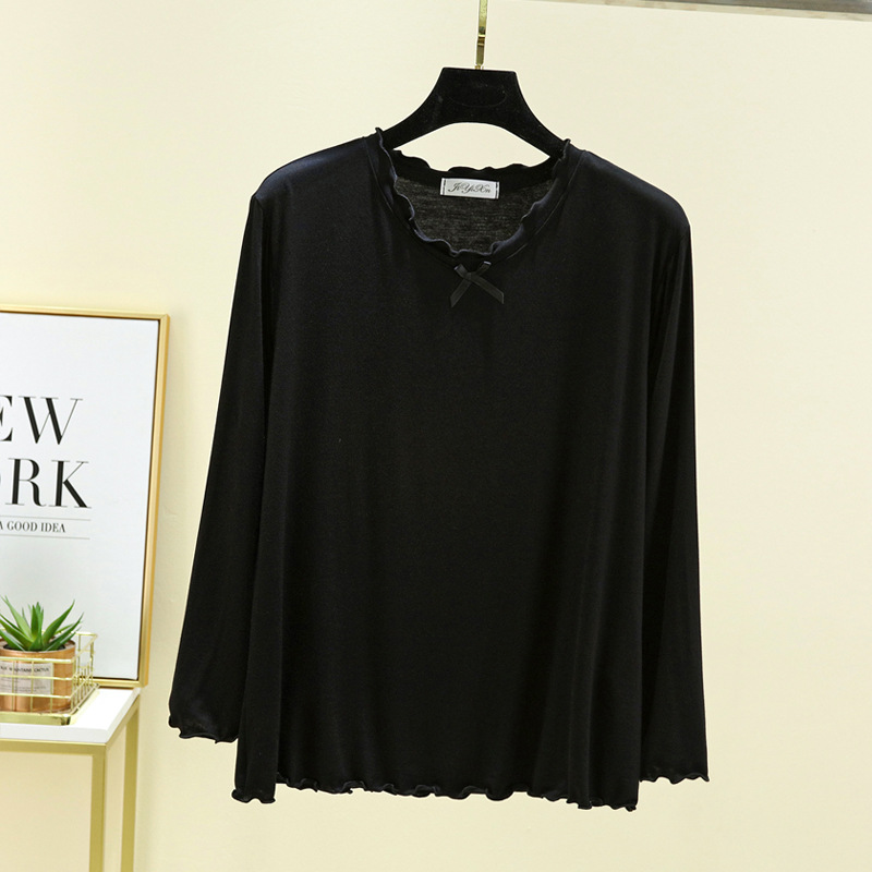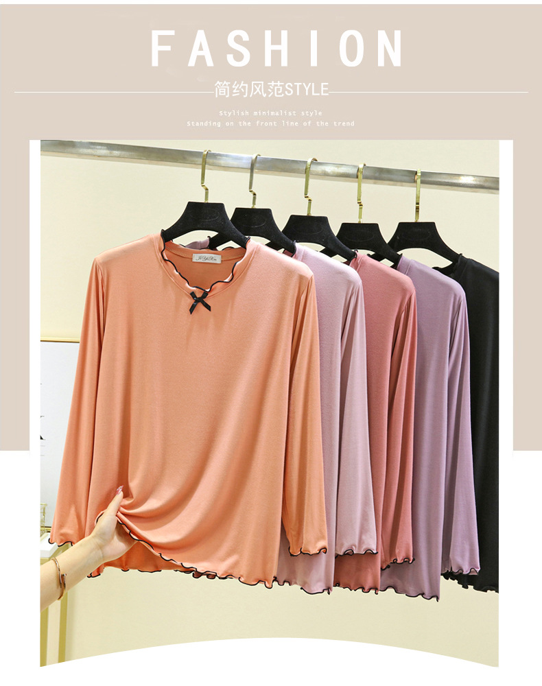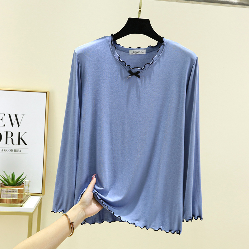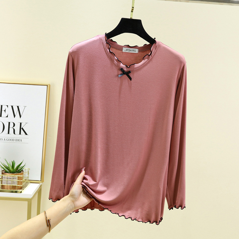 모달 긴팔 티셔츠 여성용 봄과 가을 얇은 봄 착용 슬림 인터넷 인기 탑 보우 웨이브 칼라 베이스 셔츠
