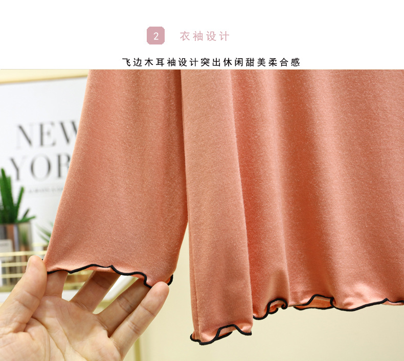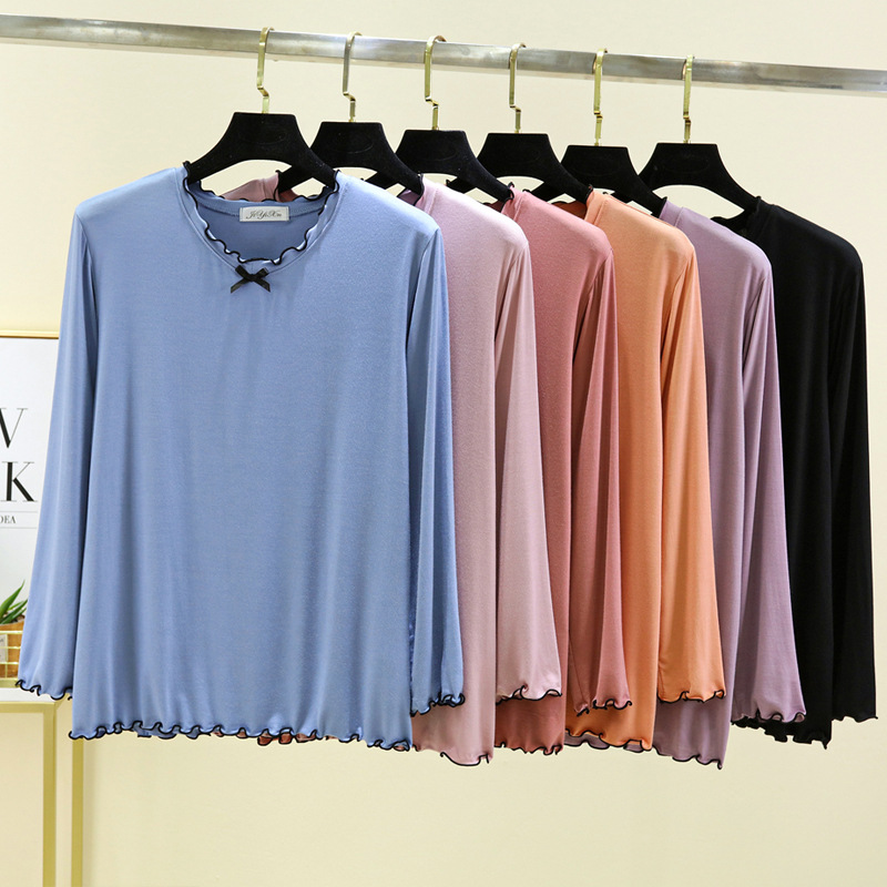 모달 긴팔 티셔츠 여성용 봄과 가을 얇은 봄 착용 슬림 인터넷 인기 탑 보우 웨이브 칼라 베이스 셔츠스토어 가기