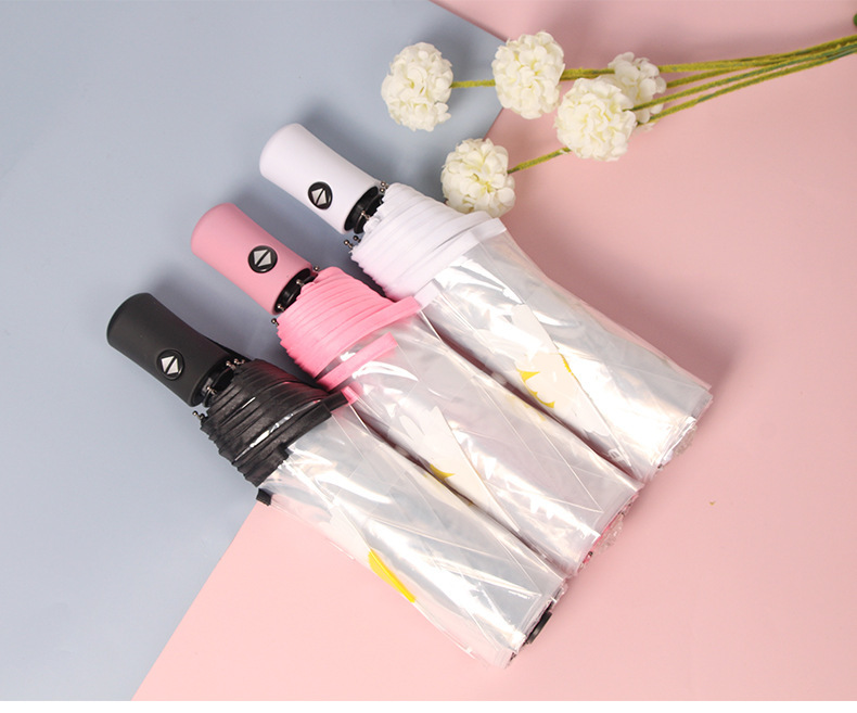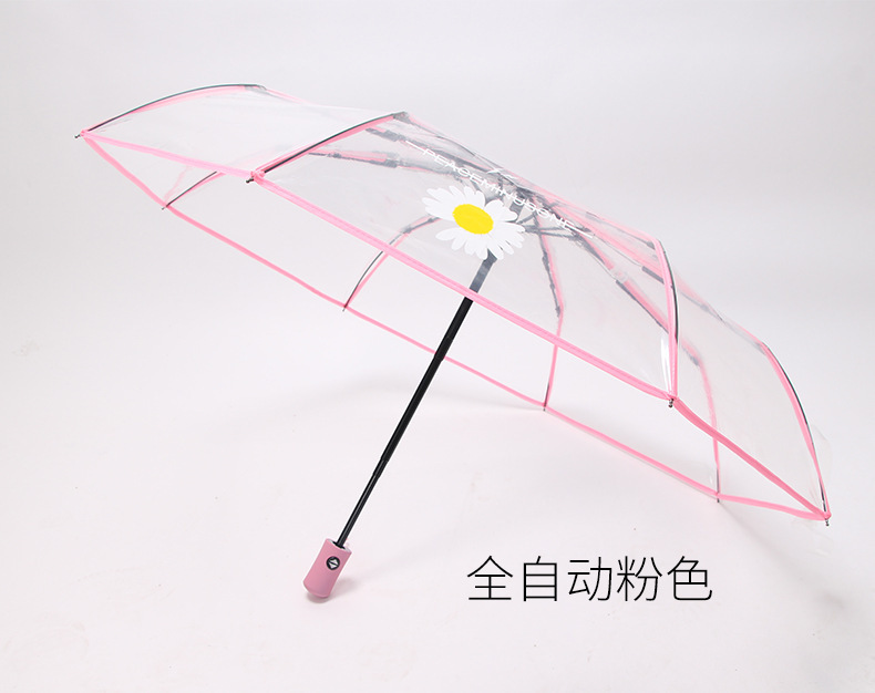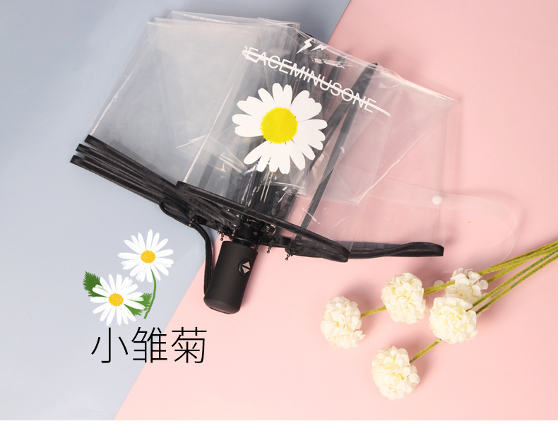 작은 신선한 스타일 학생 접는 3 중 우산 INS 일본식 데이지 우산 인쇄 로고 자동 투명 우산스토어 가기