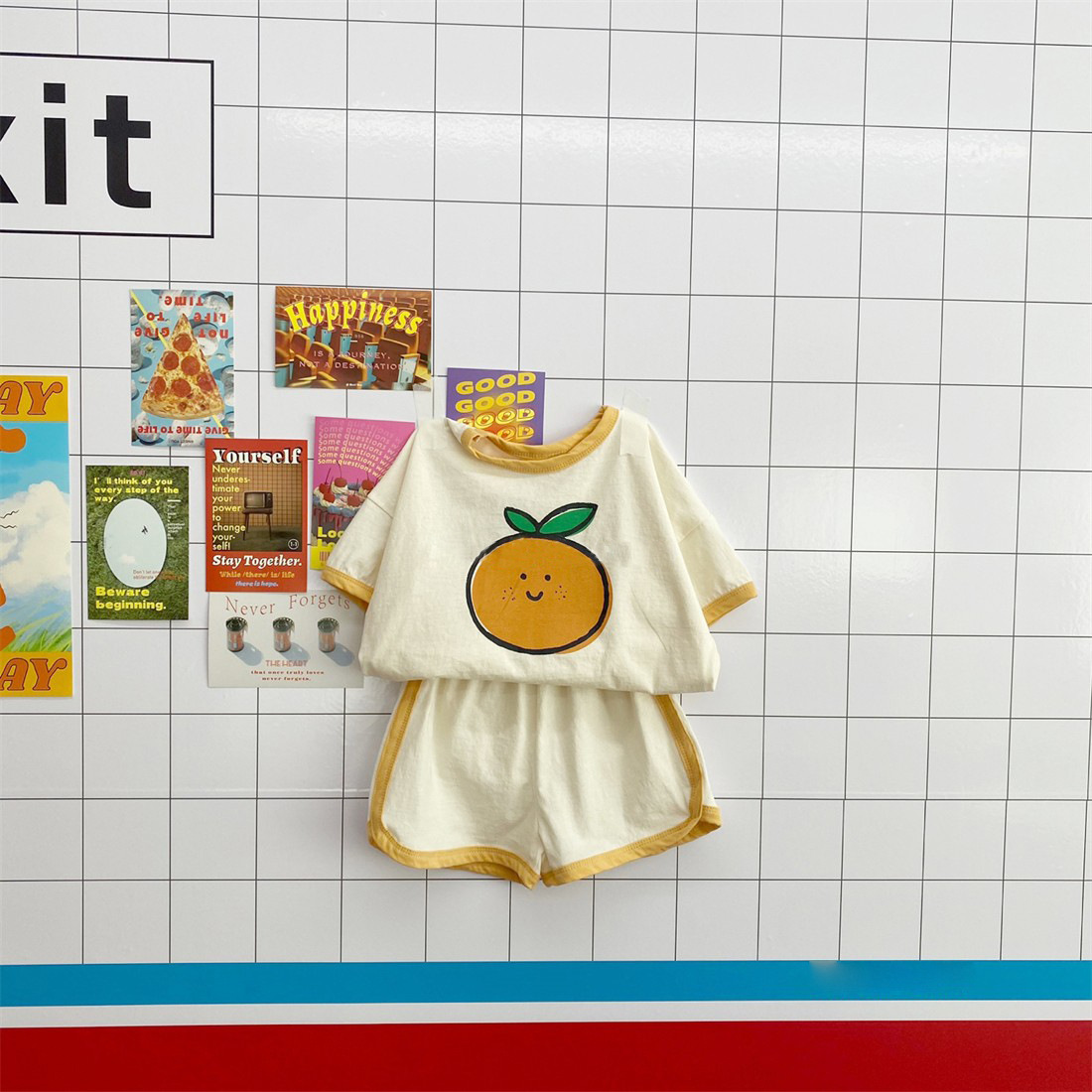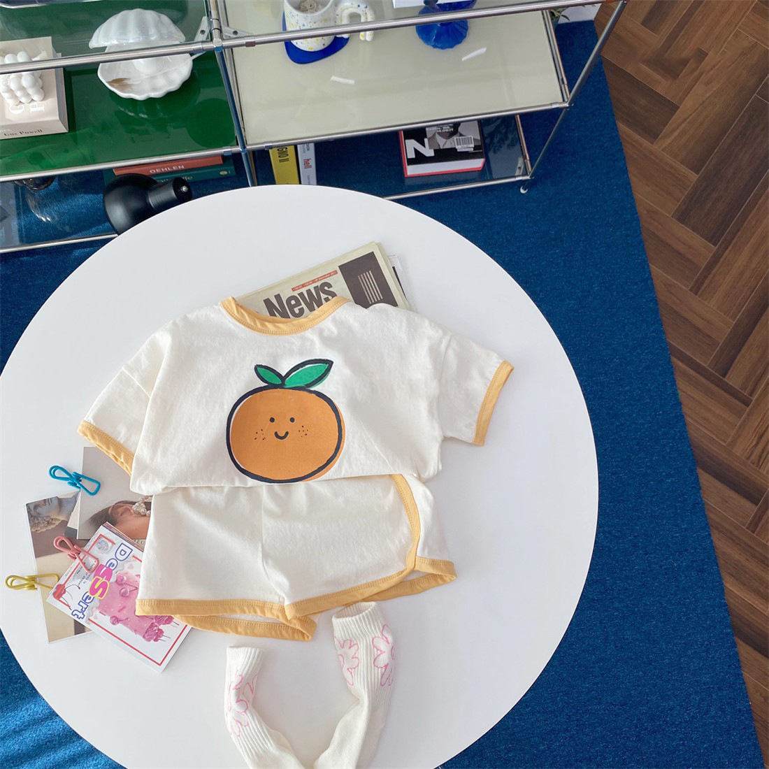 여름 남성과 여성의 아기 얇은면 귀여운 과일 인쇄 반팔 티셔츠 + 반바지 세트 조수의 한국어 버전
