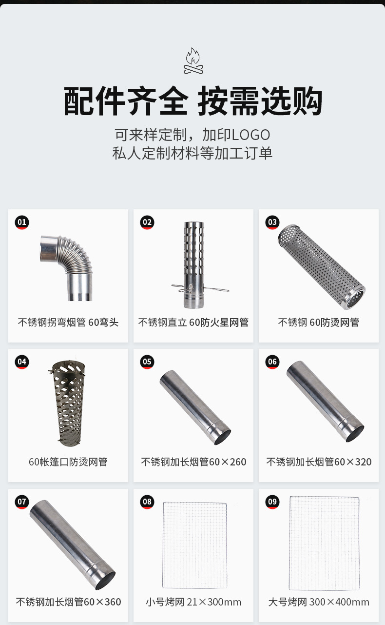 투펑 60mm 직경 스테인리스 텐트 스토브 부품, 메쉬 파이프, 조절식 연기관, 굽은 파이프, 그릴망, 그릴판, 아웃도어 캠핑용