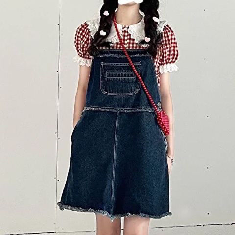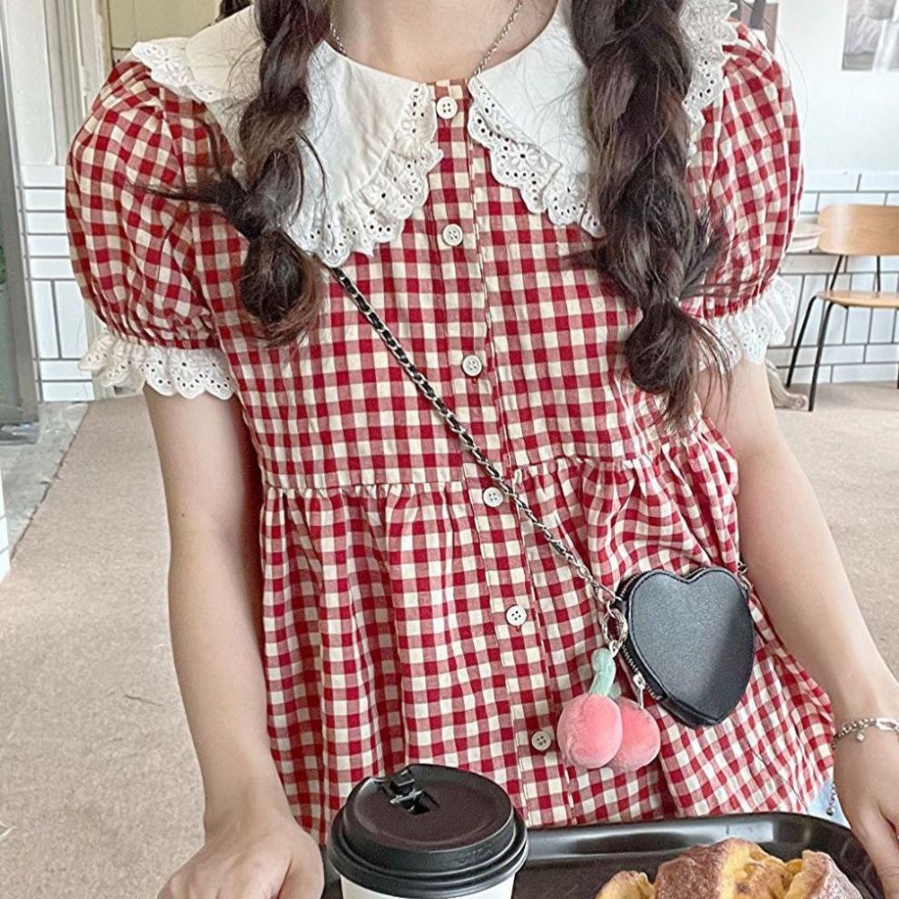 여름 일본식 부드러운 소녀 귀여운 격자 무늬 인형 칼라 레이스 버블 슬리브 셔츠 여성 학생 모든 매치 신선한 스타일 탑스토어 가기