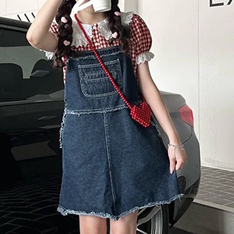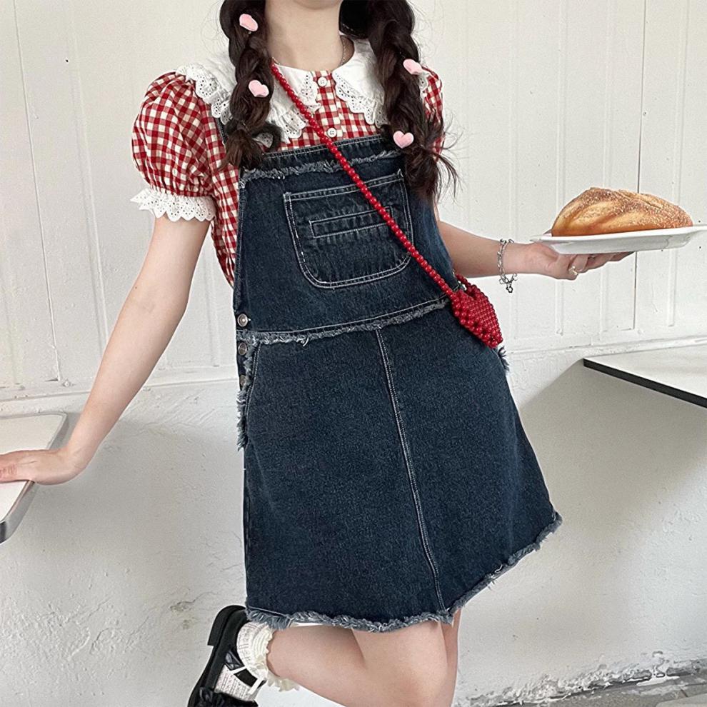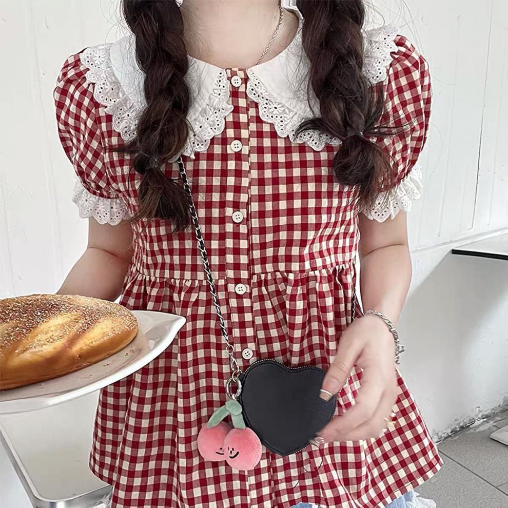 여름 일본식 부드러운 소녀 귀여운 격자 무늬 인형 칼라 레이스 버블 슬리브 셔츠 여성 학생 모든 매치 신선한 스타일 탑