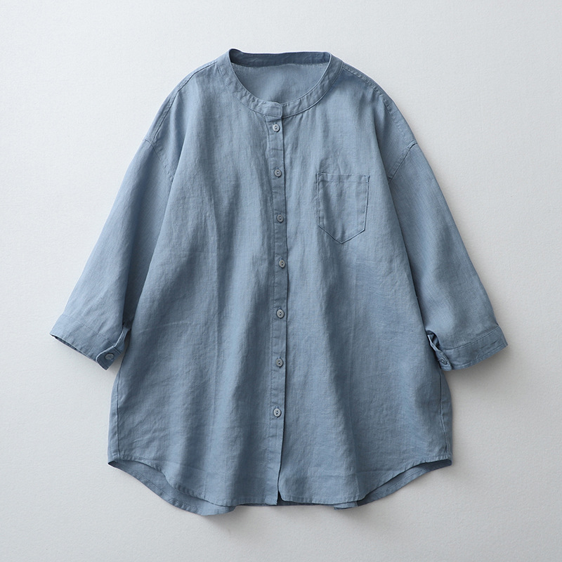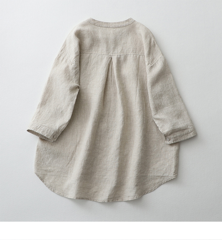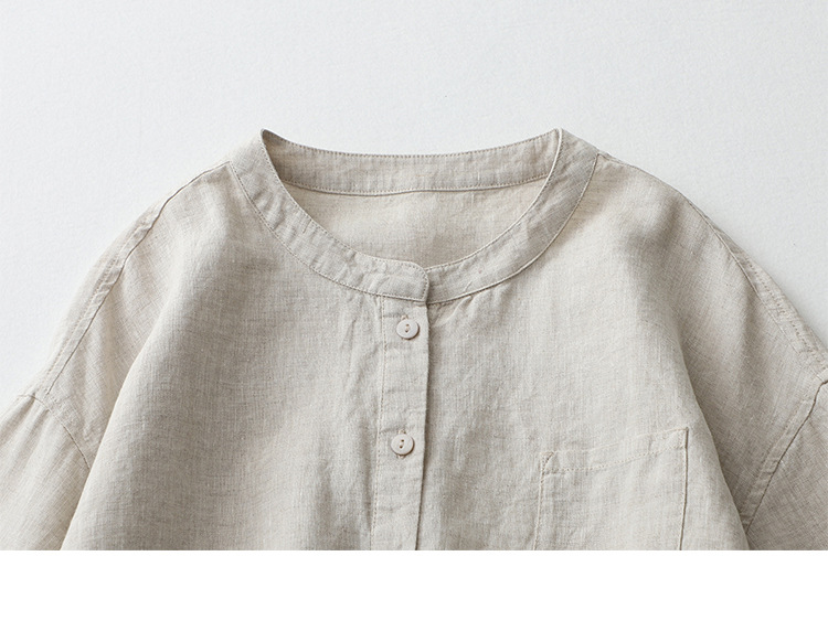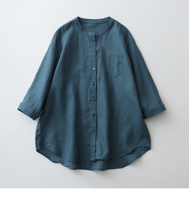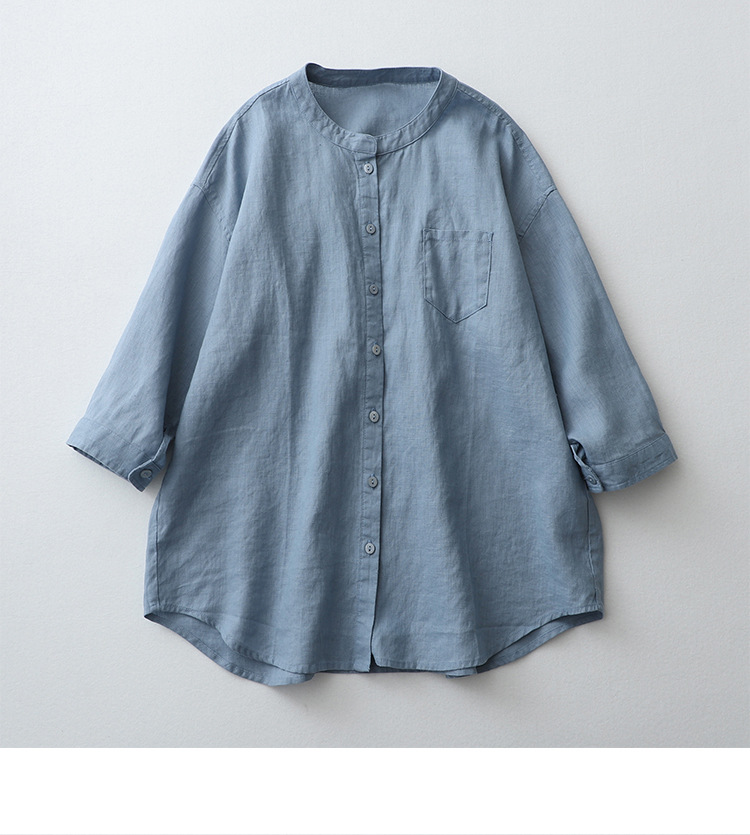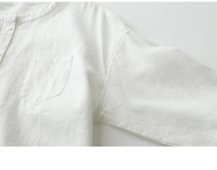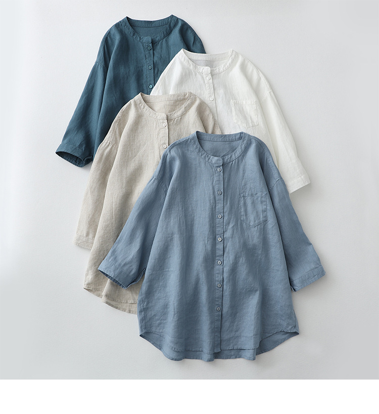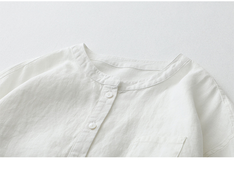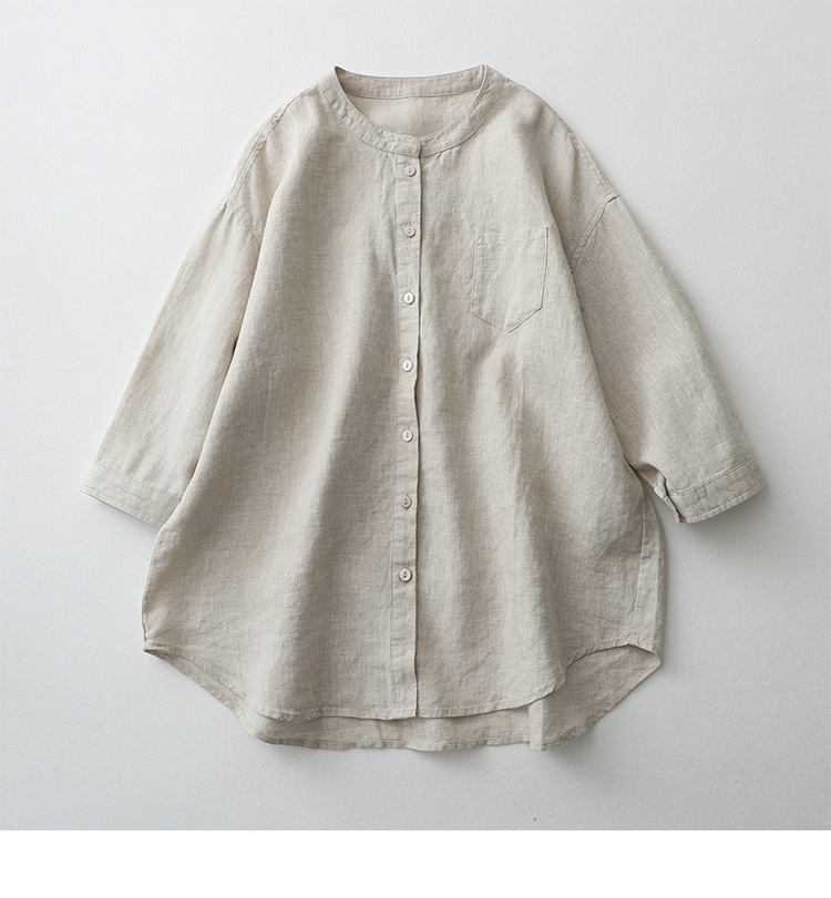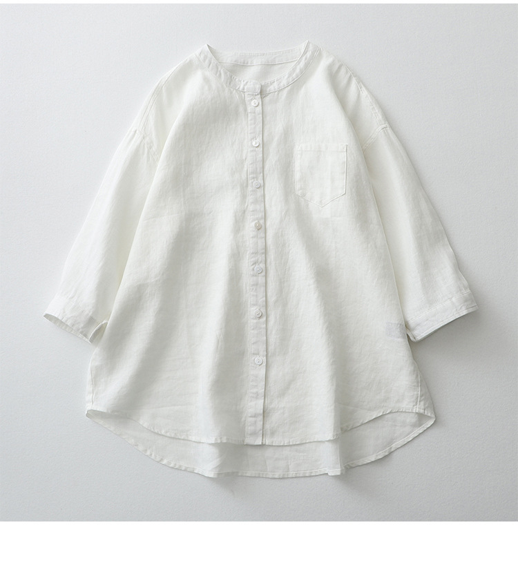 2025 여름 린넨 셔츠 스탠드 칼라 7부 소매 흰색 셔츠 루즈한 대형 자외선 차단 셔츠 일본 면 및 린넨 여성 의류스토어 가기