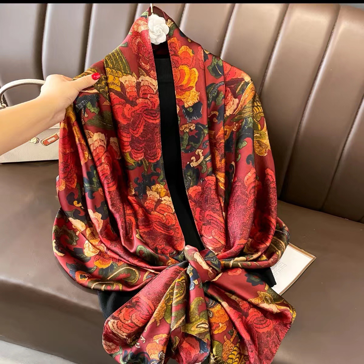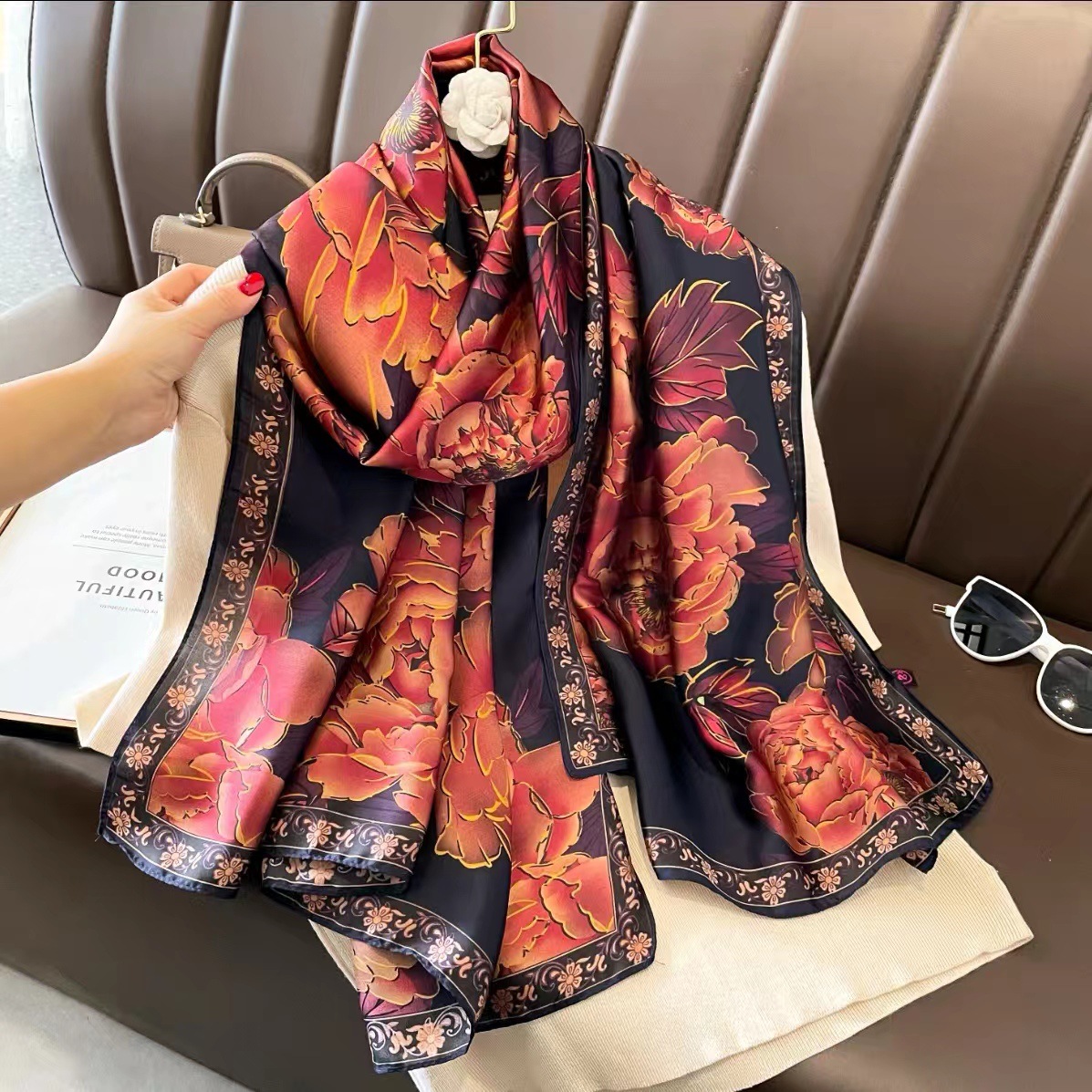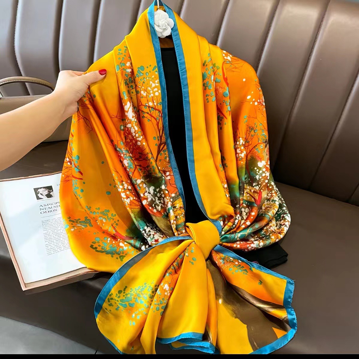 2023 플라워 롱 스카프 시뮬레이션 실크 스카프 여성용 인쇄 새로운 실크 새틴 비치 스카프 에스닉 대형 숄 스카프