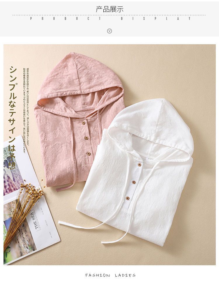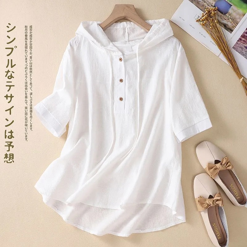 자카드 자수 면마 반팔 상의 여성용 2025 여름 신상 문예 민족풍 캐주얼 루즈핏 후드 티셔츠스토어 가기