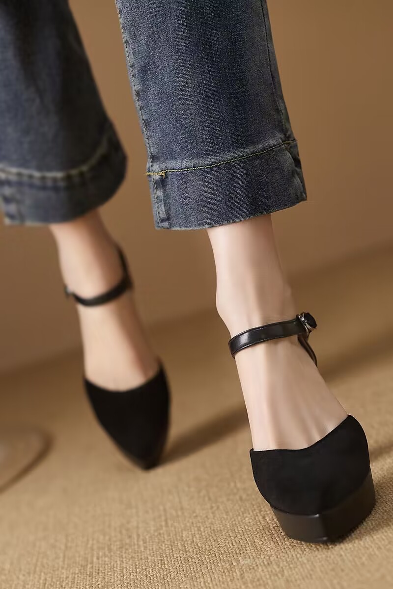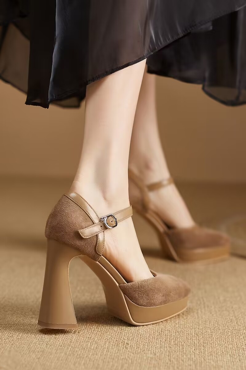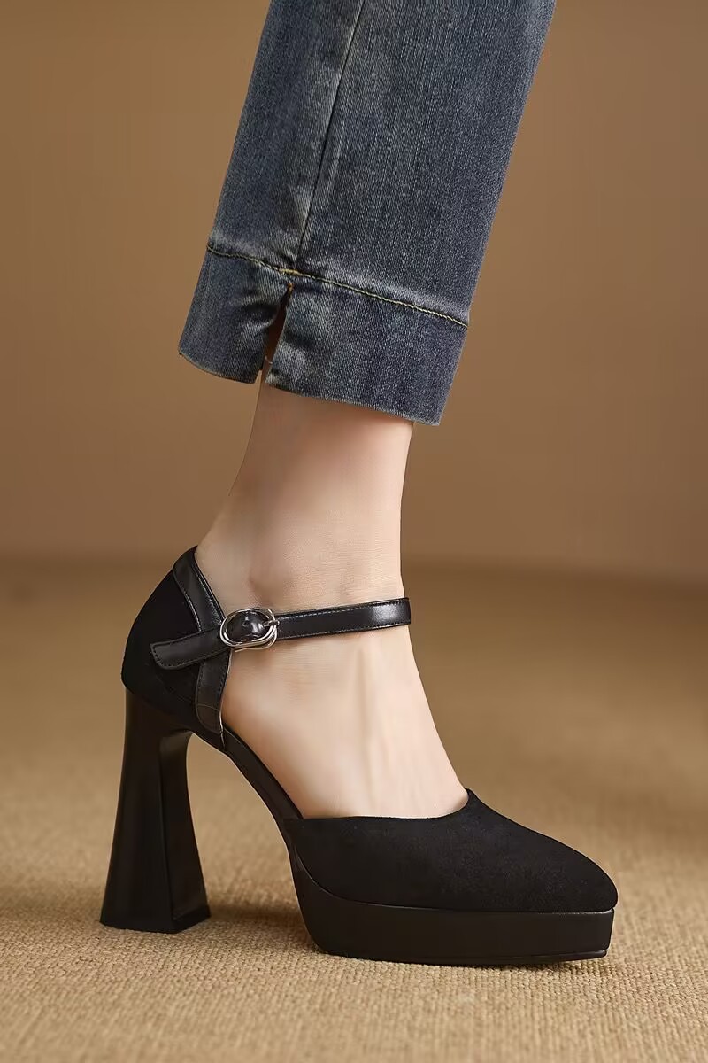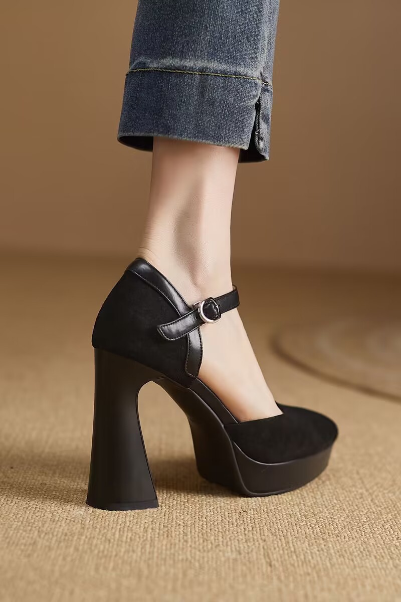 우아한 거친 뒤꿈치 젖빛 부드러운 가죽 하이힐 여성용 2023 봄 방수 플랫폼 얕은 입을 가진 두꺼운 바닥 뾰족한 단일 신발스토어 가기