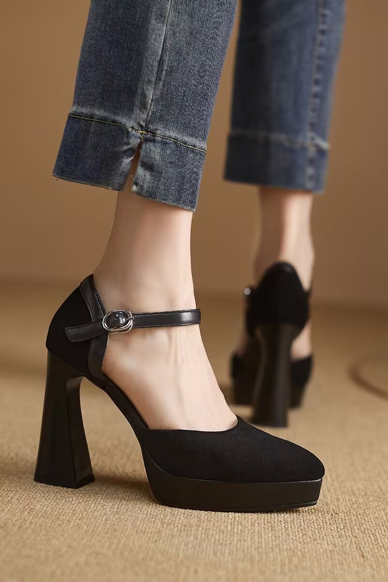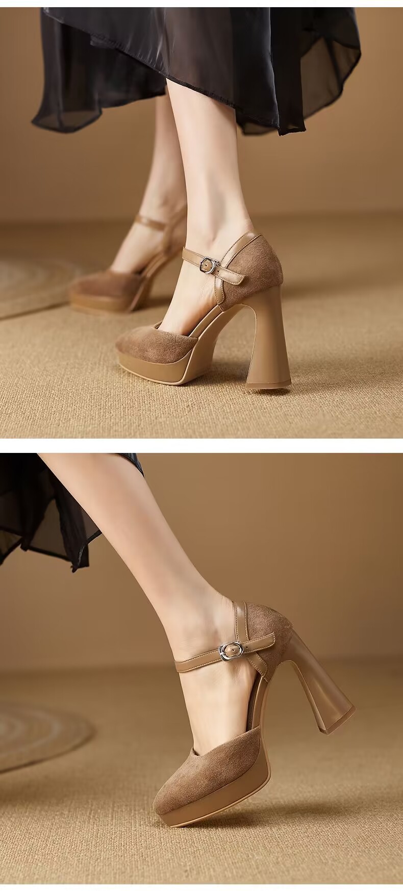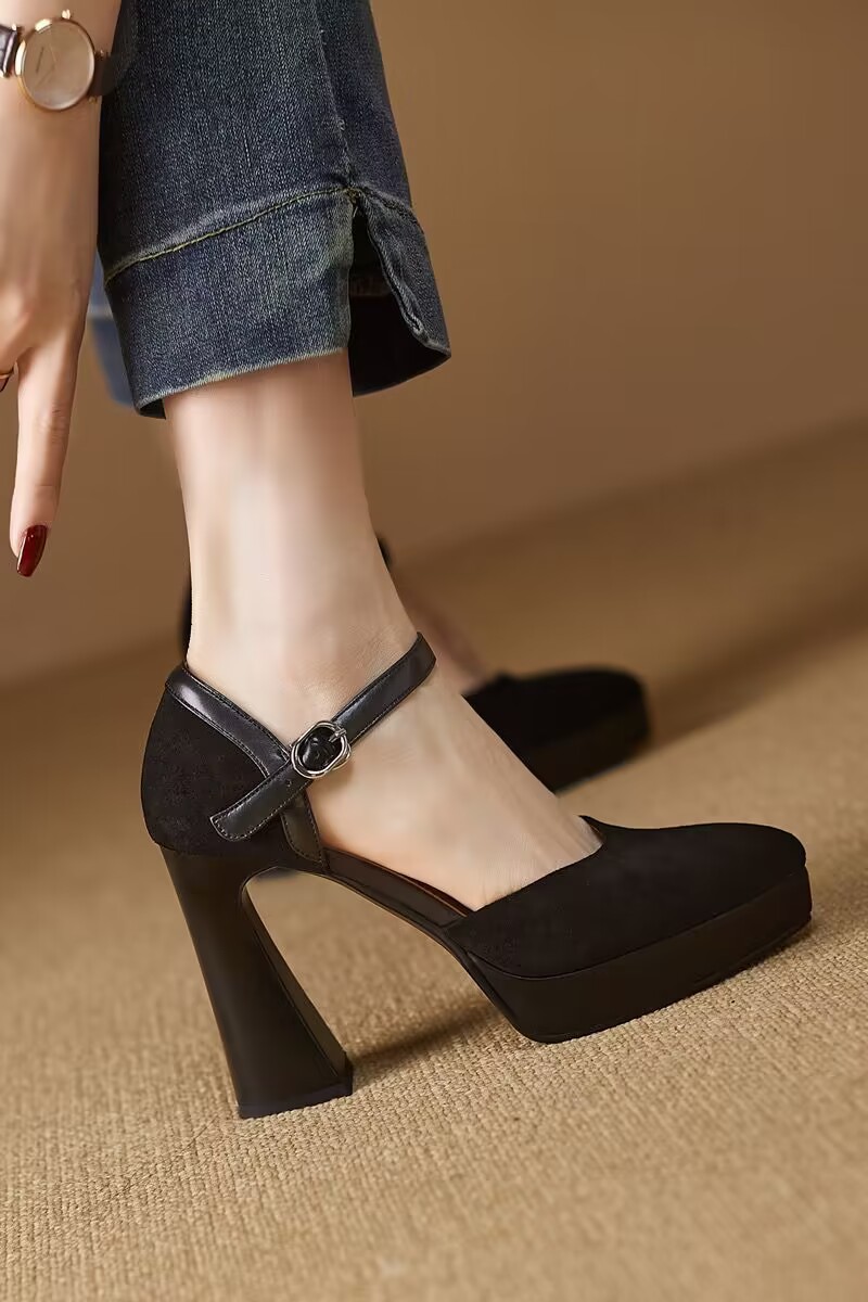 우아한 거친 뒤꿈치 젖빛 부드러운 가죽 하이힐 여성용 2023 봄 방수 플랫폼 얕은 입을 가진 두꺼운 바닥 뾰족한 단일 신발스토어 가기