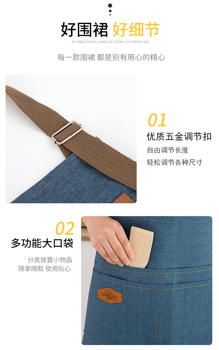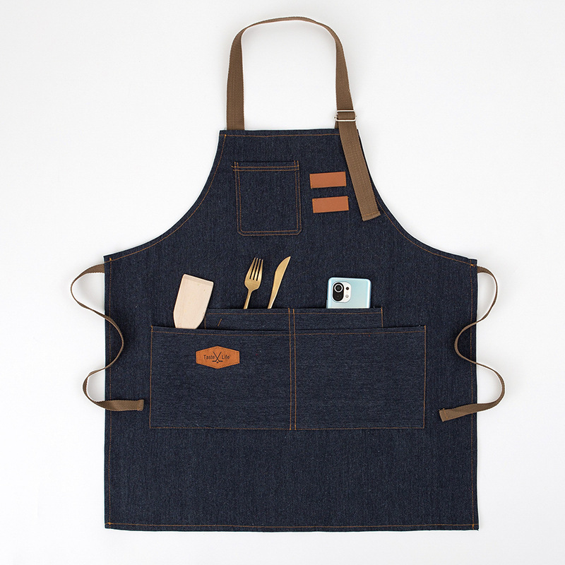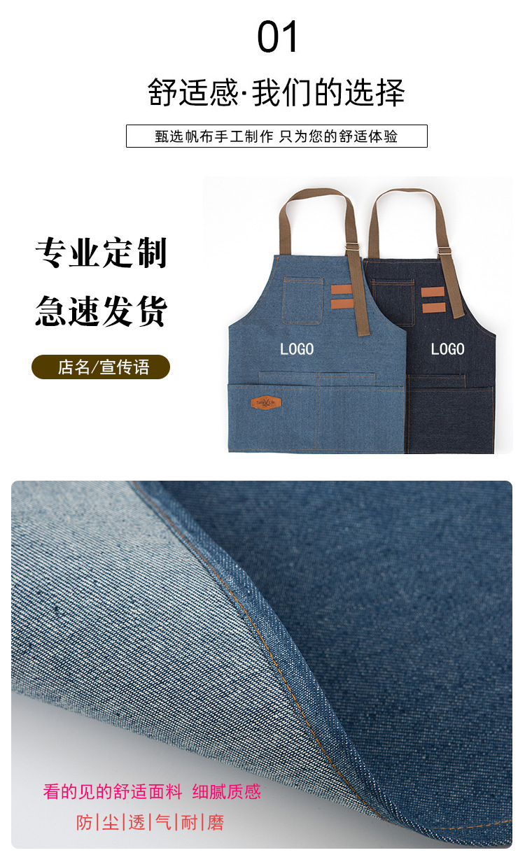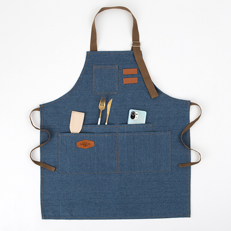 한국 패션 데님 앞치마 바리 스타 우유 차 가게 레스토랑 작업 옷 이발사 그림 인쇄 및 제조 로고스토어 가기