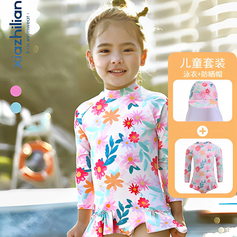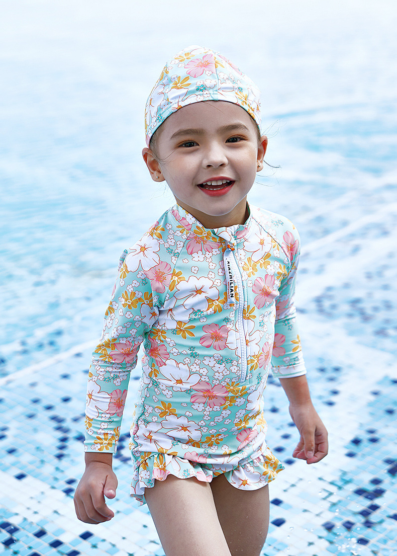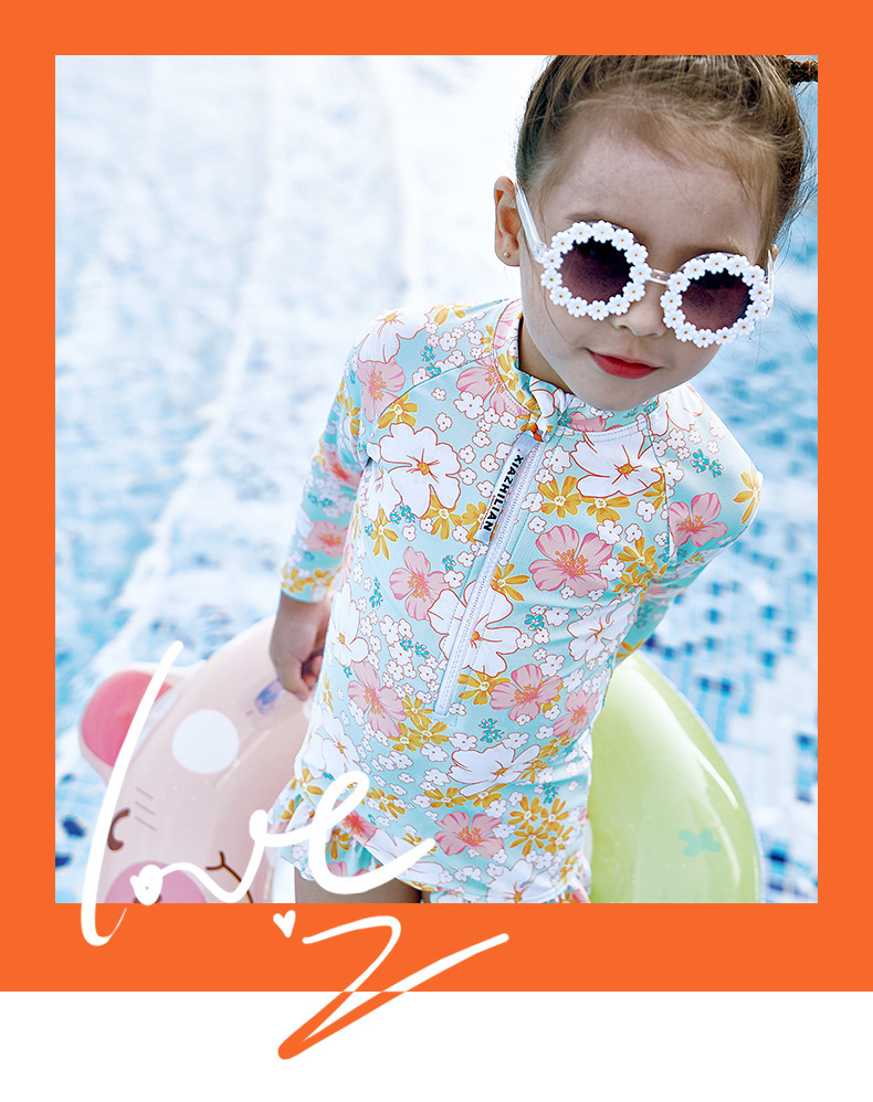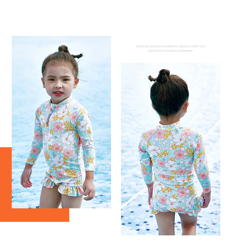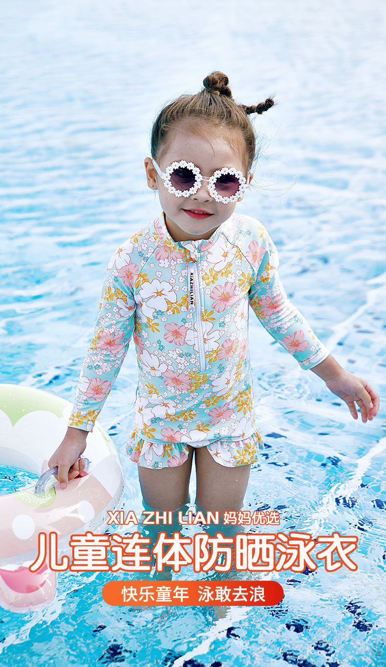 韩版女童花朵泳衣中小童连体泳衣可爱宝宝公主长袖沙滩防晒冲浪服