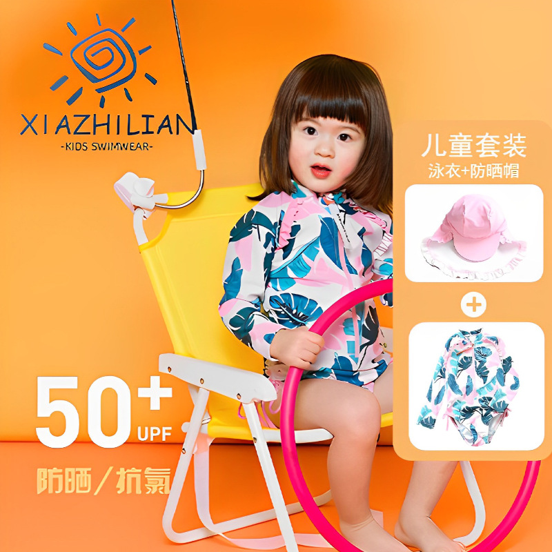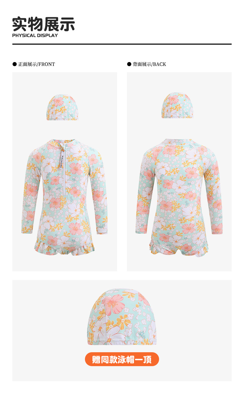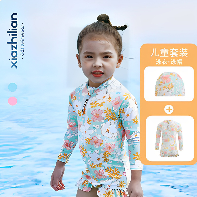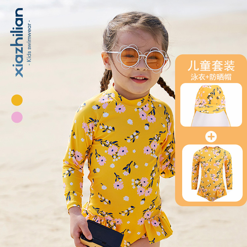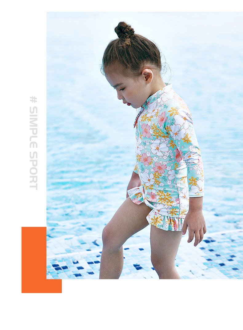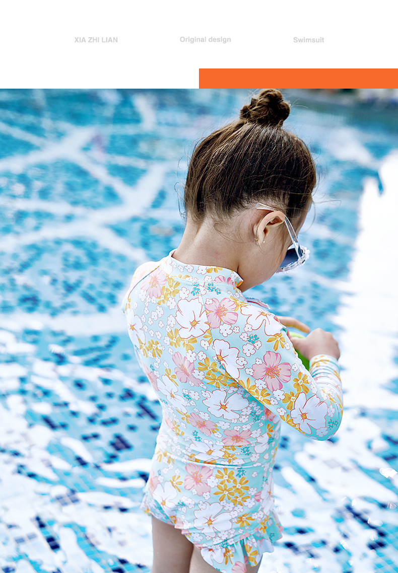 韩版女童花朵泳衣中小童连体泳衣可爱宝宝公主长袖沙滩防晒冲浪服