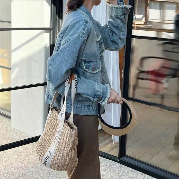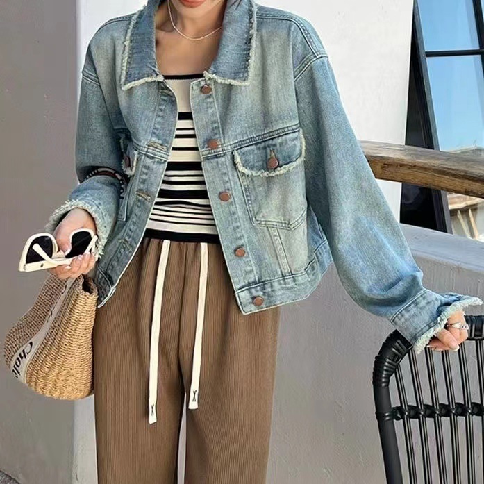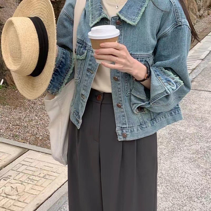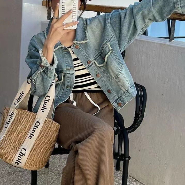 2023 봄 새로운 이른 가을 샤넬 스타일 데님 코트 여자의 복고풍 짧은 긴 소매 느슨한 패션 재킷스토어 가기