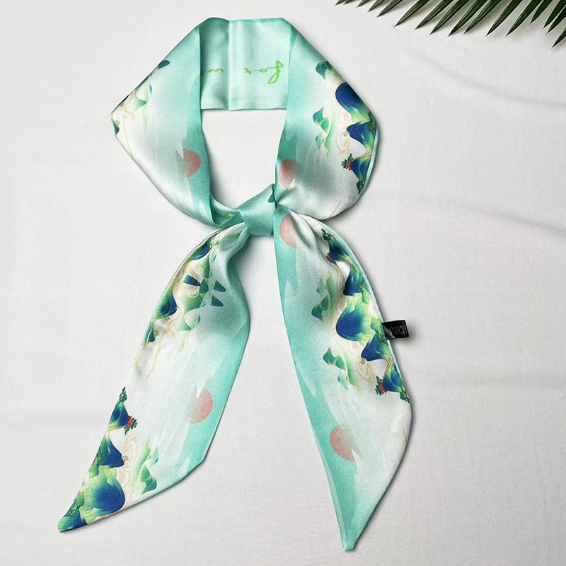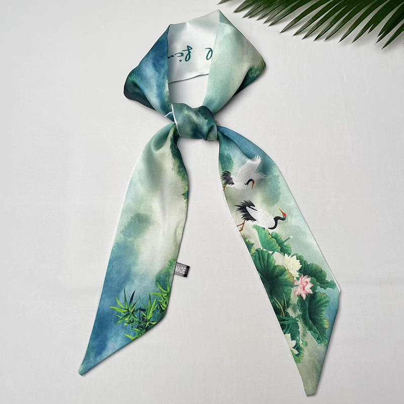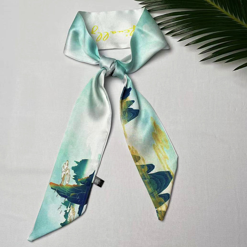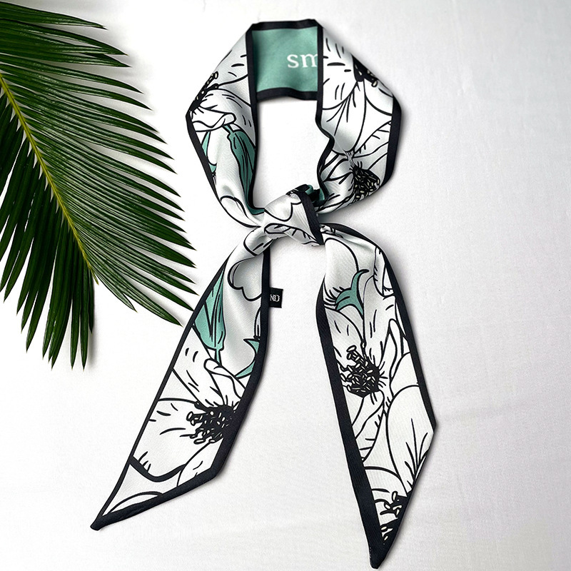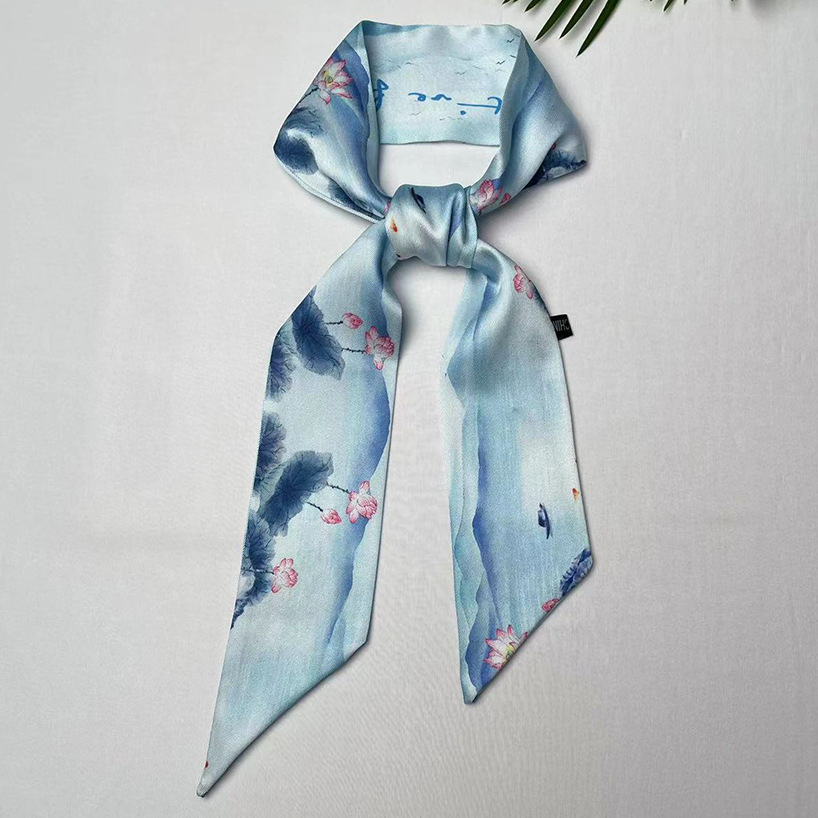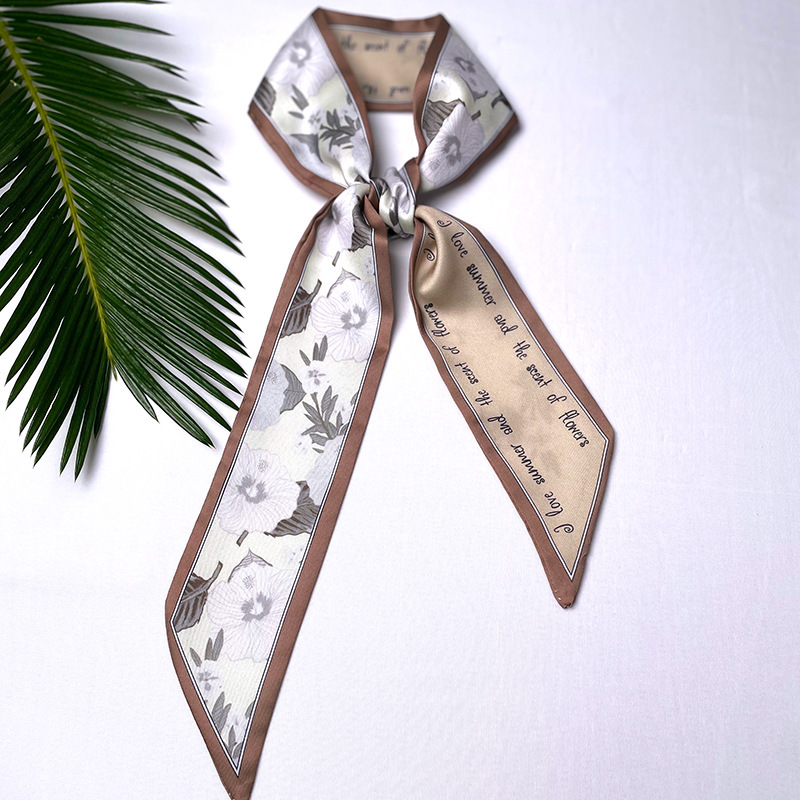 한국 스타일 신상품 뾰족한 꽃 프린트 리본 긴 실크 스카프 여성용 좁은 다기능 모든 매치 장식 리본 작은 스카프