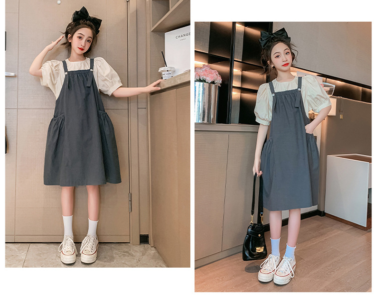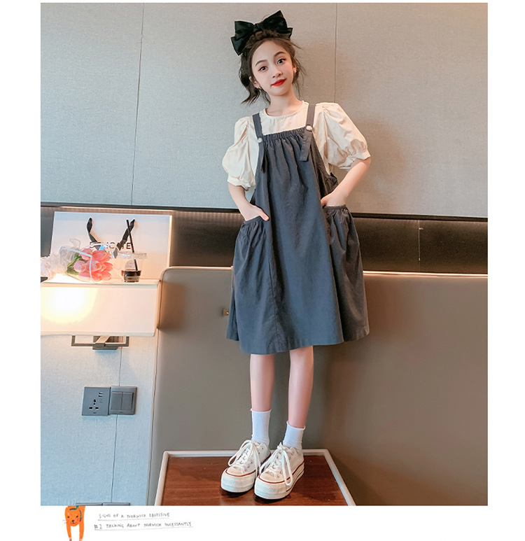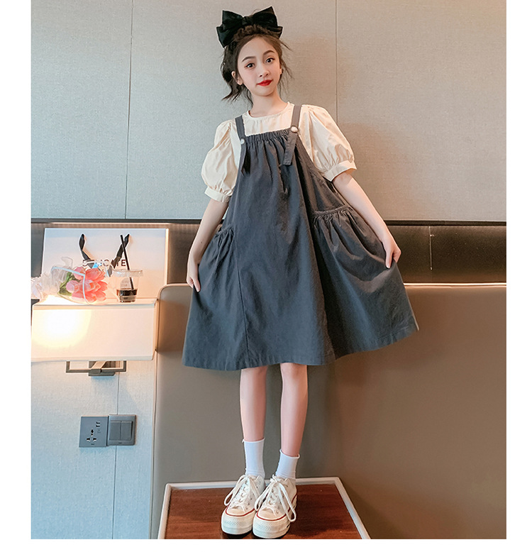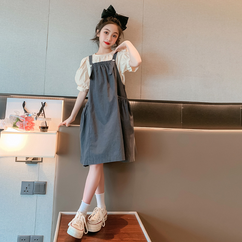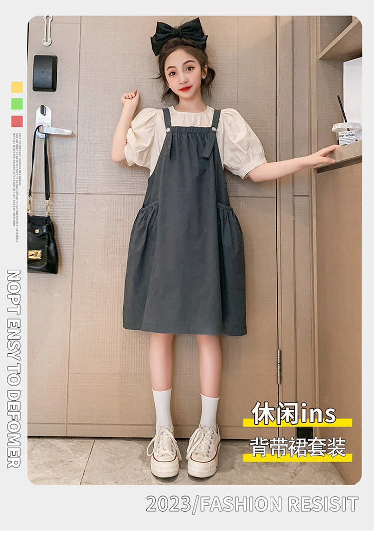 여자 원피스 여름 2023 새로운 어린이 치마 여름 서양 스타일 공주 치마 여자의 큰 어린이 스트랩 스커트 세트