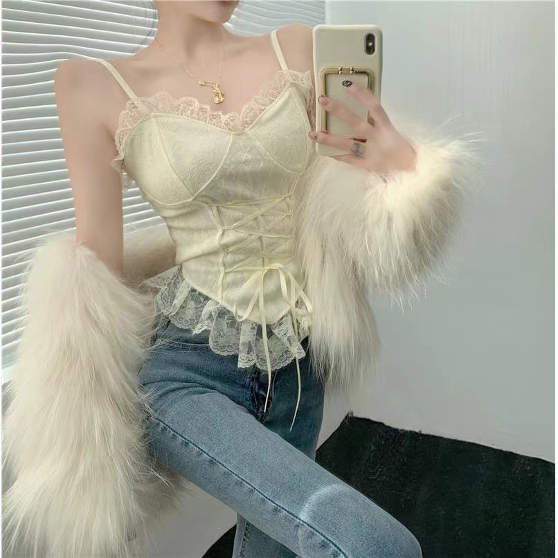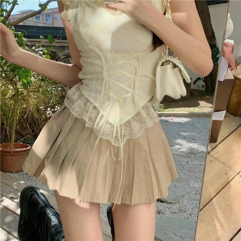 프랑스 스타일의 틈새 디자인 센스 메쉬 스티칭 귀 장식 홀터 탑 여성용 2023 봄 여름 레이스업 슬림핏 조끼