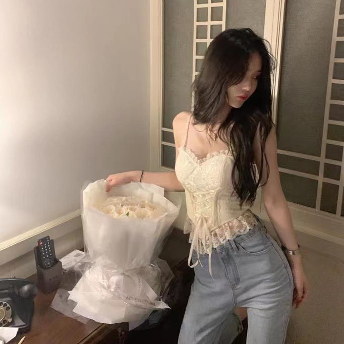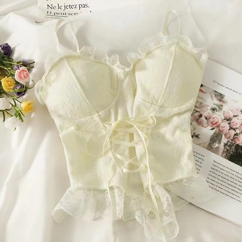 프랑스 스타일의 틈새 디자인 센스 메쉬 스티칭 귀 장식 홀터 탑 여성용 2023 봄 여름 레이스업 슬림핏 조끼스토어 가기