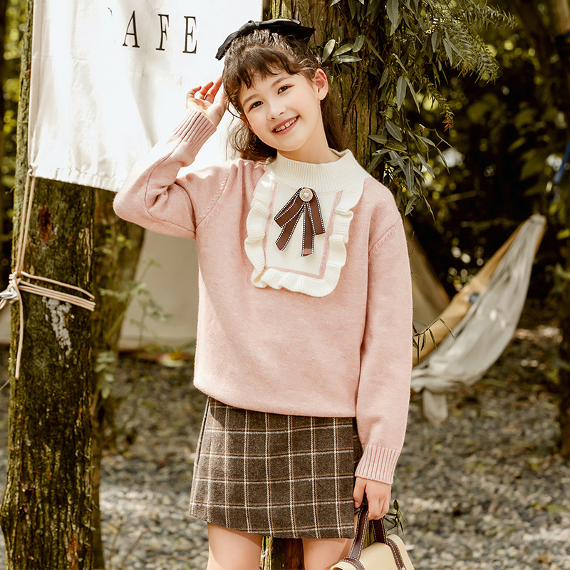 蝴蝶结女童毛衣2024春秋装新款中大童针织衫加绒儿童毛衣童装打底