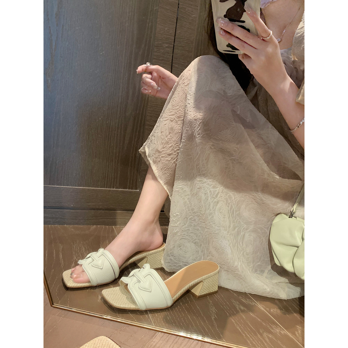 재고 포도 어머니의 제주도 여행 다수 ~ 짚 플랫 스퀘어 헤드 두꺼운 힐 휴가 슬리퍼 여성