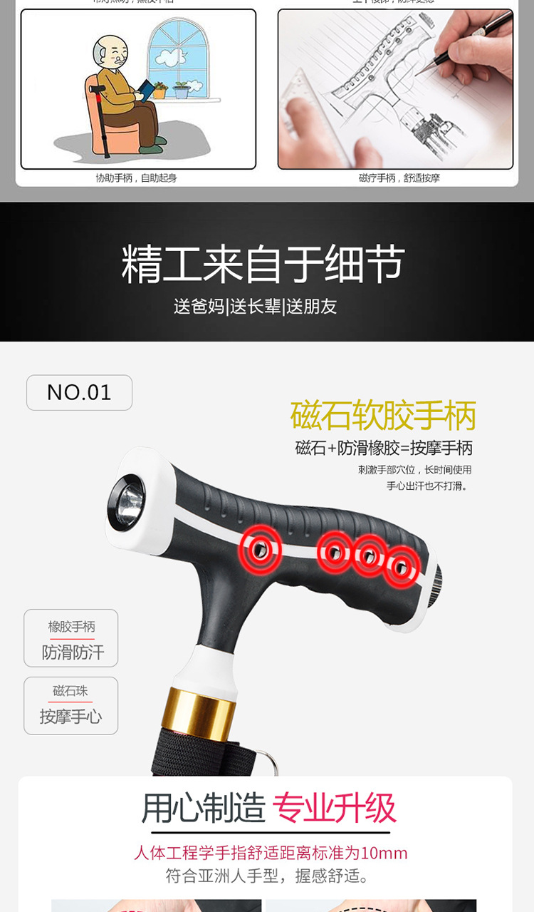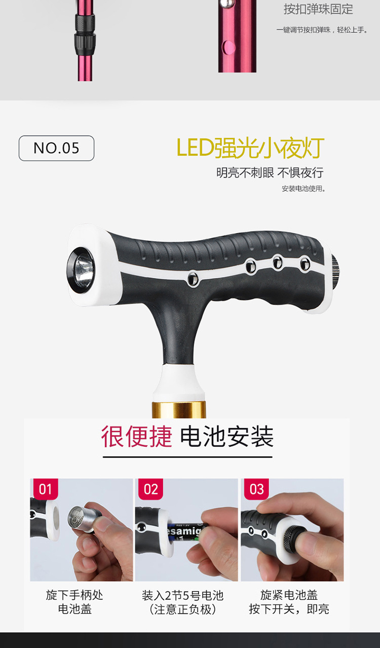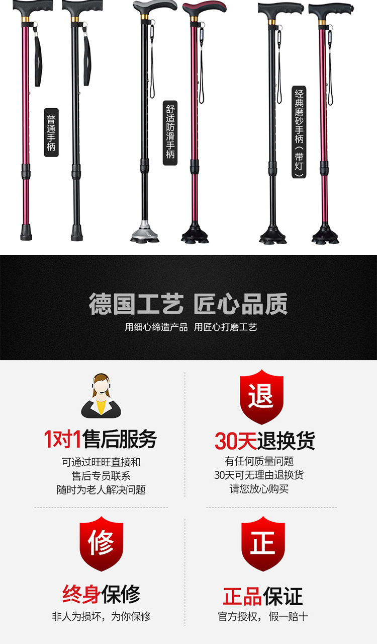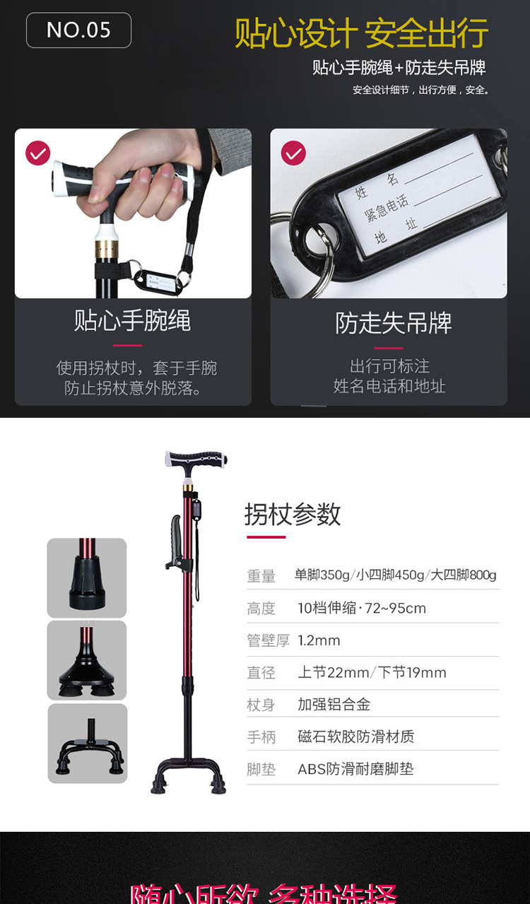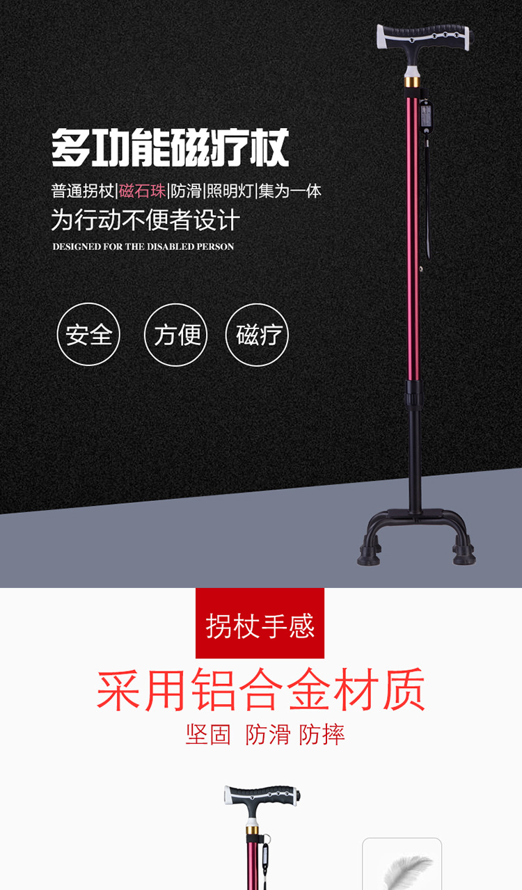마그네틱 테라피 핸들 미끄럼 방지 라이트 스틱 8 개의 스틱이있는 노인을위한 4 족 보행 스틱 텔레스코픽 워킹 스틱