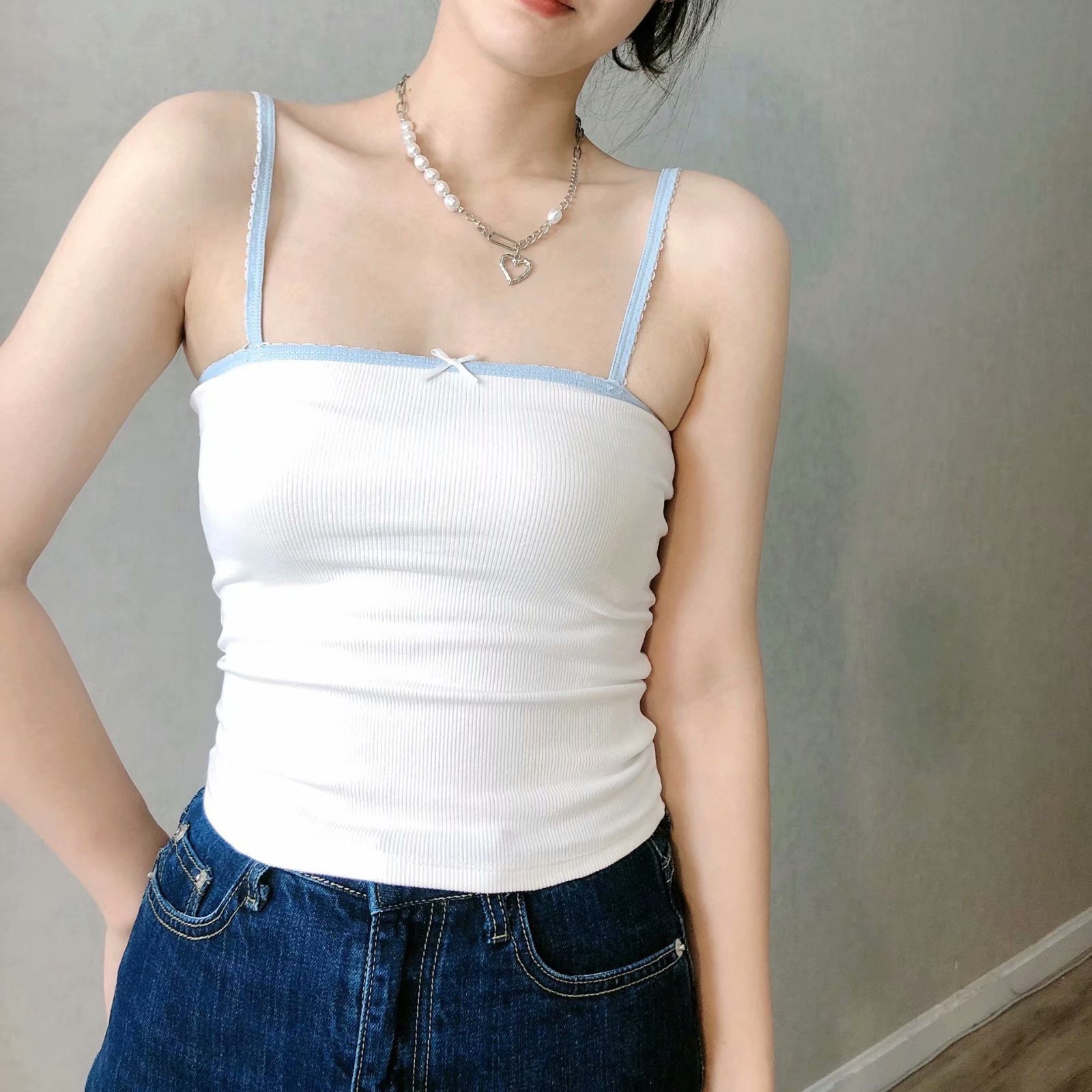 웨이브 레이스 보우 캐미솔 여성용 여름 bm 스타일 슬림핏 슬리밍 짧은 배꼽 노출 모든 매치 베이스 탑스토어 가기