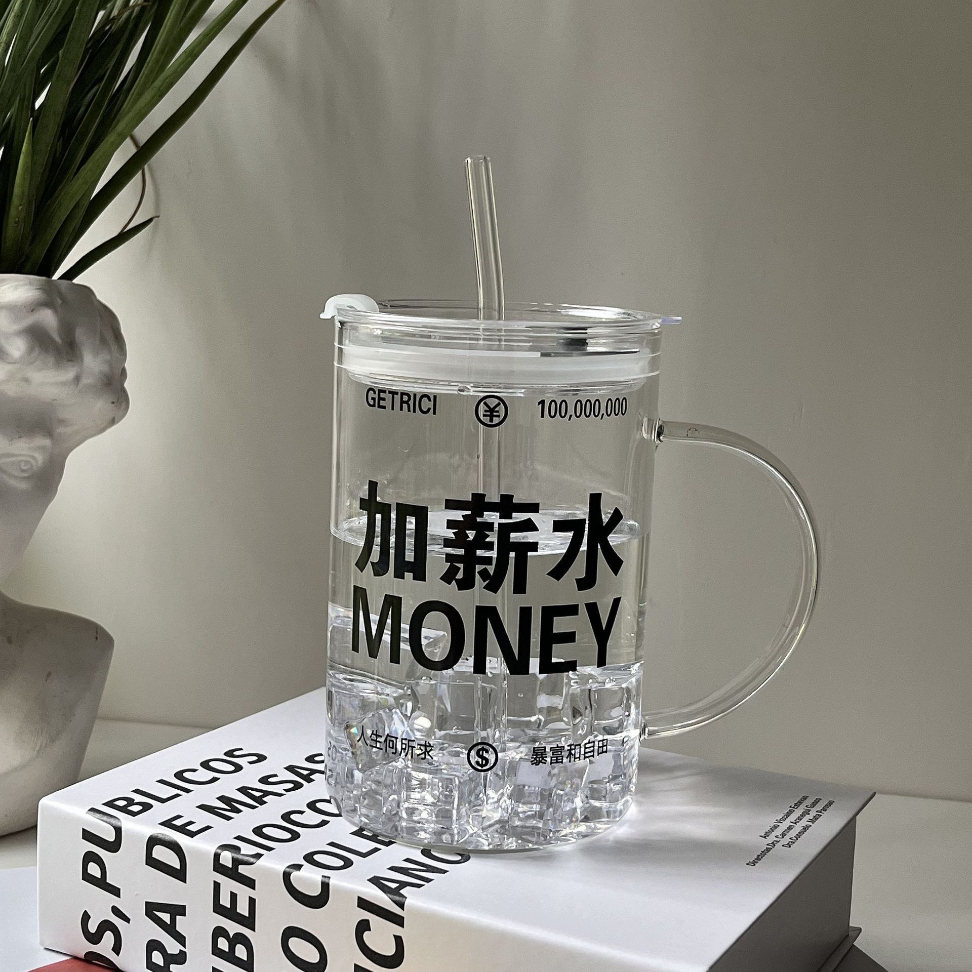• 급여 인상 (돌연 부자) 투명 컵 본체 + 스테인리스 빨대 + 컵 뚜껑 + 빨대 브러시
