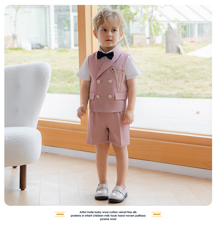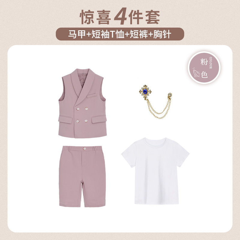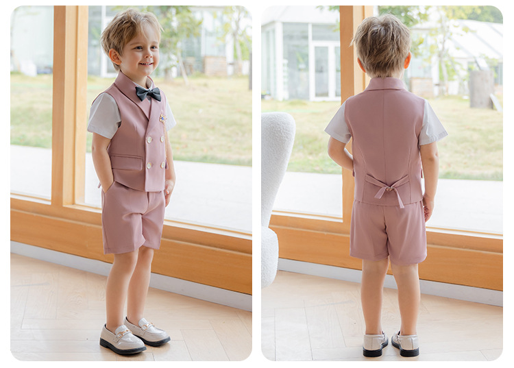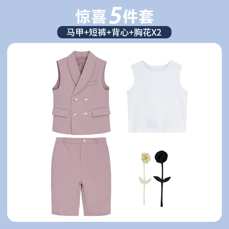 • 핑크 5 종 세트 (조끼 + 반팔 셔츠 + 반바지 + 브로치 + 나비 넥타이)