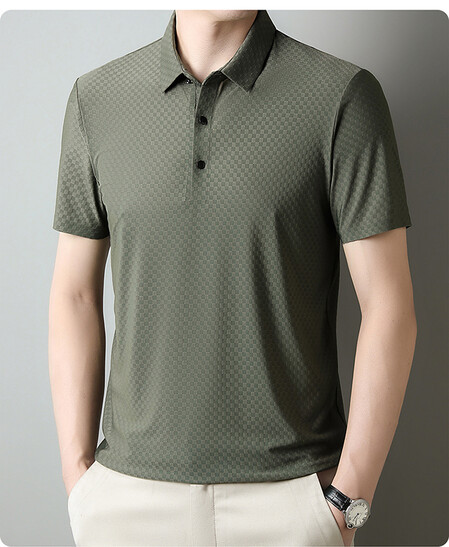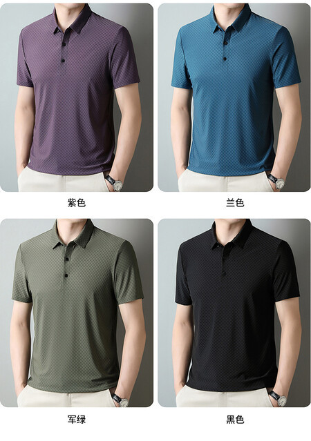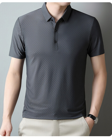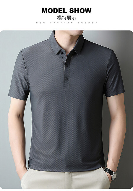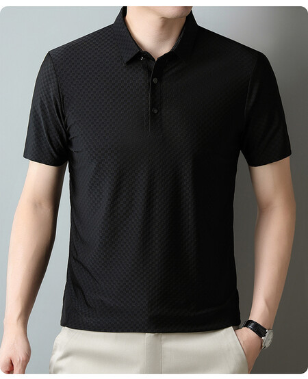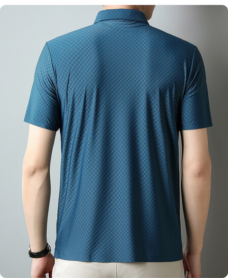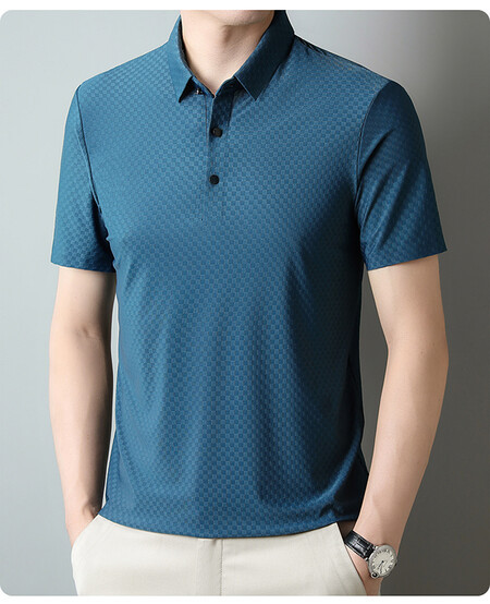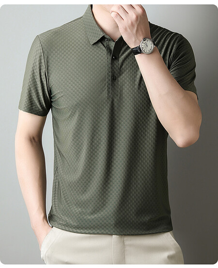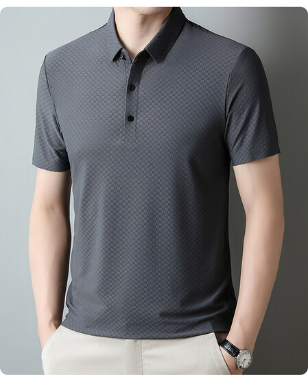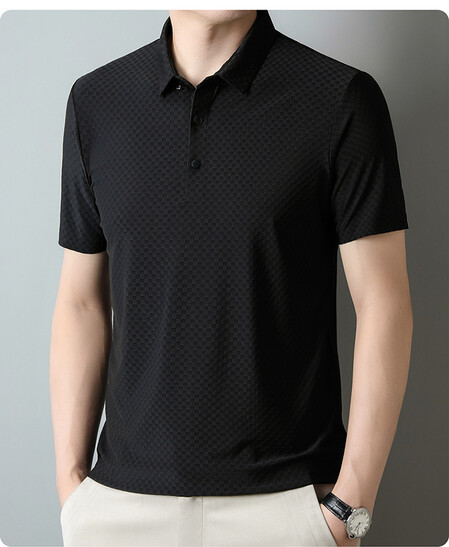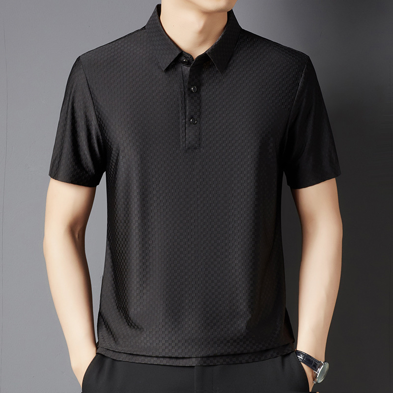 여름 새 남성용 반팔 티셔츠 라펠 세미-이음매없는 스트레치 실크 자카드 다크 체크 얇은 슬림 핏 하프 슬리브